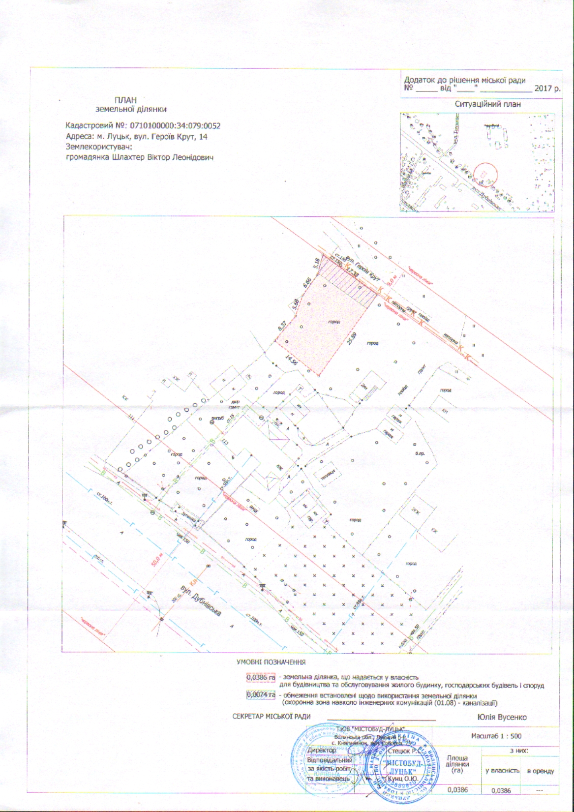 2. Надати громадянину Шлахтеру Віктору Леонідовичу у власність земельну ділянку на вул. Героїв Крут, 14 площею 0,0386 га, кадастровим номером 0710100000:34:079:0052 для будівництва та обслуговування жилого будинку, господарських будівель і споруд, згідно з додатком.