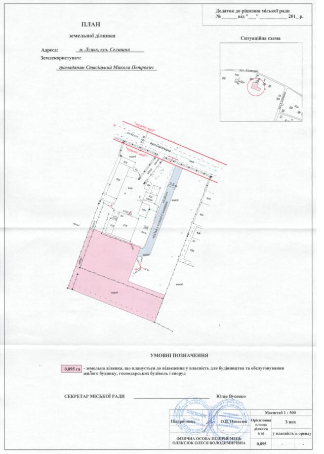 1. Надати громадянину Стасіцькому Миколі Петровичу дозвіл на розроблення проекту землеустрою щодо відведення земельної ділянки у власність для будівництва та обслуговування жилого будинку, господарських будівель і споруд на вул. Селищній орієнтовною площею 0,095 га, згідно з додатком.