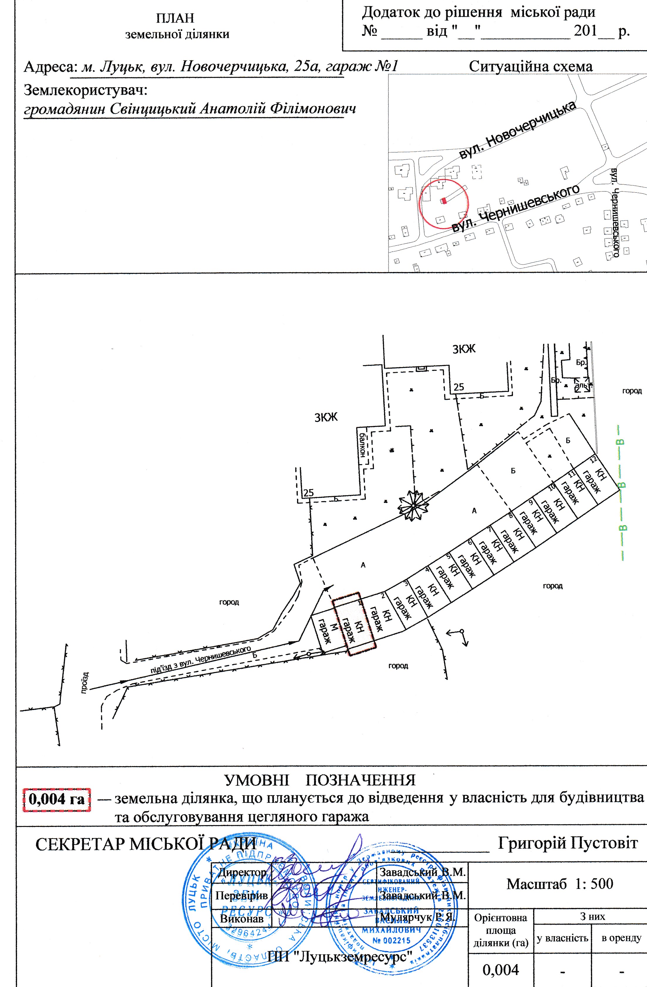 Розглянувши заяву громадянина Свінцицького Анатолія Філімоновича про надання дозволу на розроблення проекту землеустрою щодо відведення земельної ділянки на вул. Новочерчицькій, 25а, гараж №1 для будівництва та обслуговування цегляного гаража, технічний паспорт на об’єкт нерухомого майна, свідоцтво про право власності, витяг про реєстрацію права власності на нерухоме майно, генплан земельної ділянки, лист управління містобудування та архітектури Луцької міської ради щодо режиму забудови даної території, визначеної для містобудівних потреб генеральним планом м. Луцька та довідку з Головного управління Держгеокадастру у Волинській області, керуючись статтями 12, 116, 118, 121-122 Земельного кодексу України, Законом України «Про землеустрій» та ст. 26 Закону України «Про місцеве самоврядування в Україні», міська рада