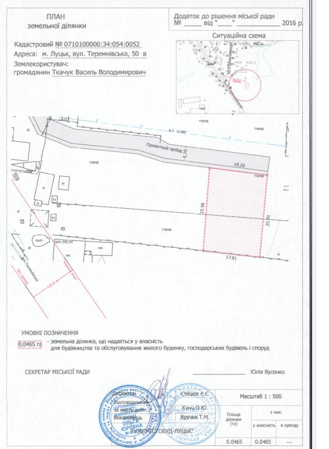 1. Затвердити громадянину Ткачуку Василю Володимировичу проект землеустрою щодо відведення земельної ділянки на вул. Теремнівській, 50в площею 0,0465 га, кадастровим номером 0710100000:34:054:0052 для будівництва та обслуговування жилого будинку, господарських будівель і споруд.