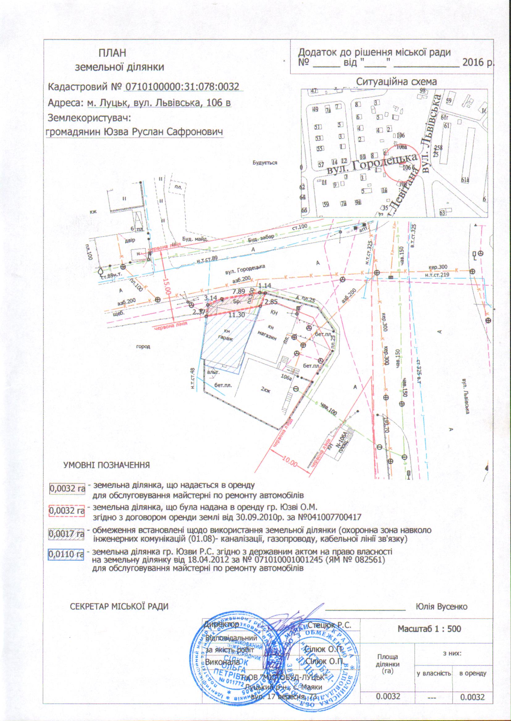 2. Надати громадянину Юзві Руслану Сафроновичу земельну ділянку на вул. Львівській, 106в, на умовах оренди строком на 10 років, площею 0,0032 га, кадастровим номером 0710100000:31:078:0032, в межах «червоних ліній» для обслуговування майстерні по ремонту автомобілів, згідно з додатком.