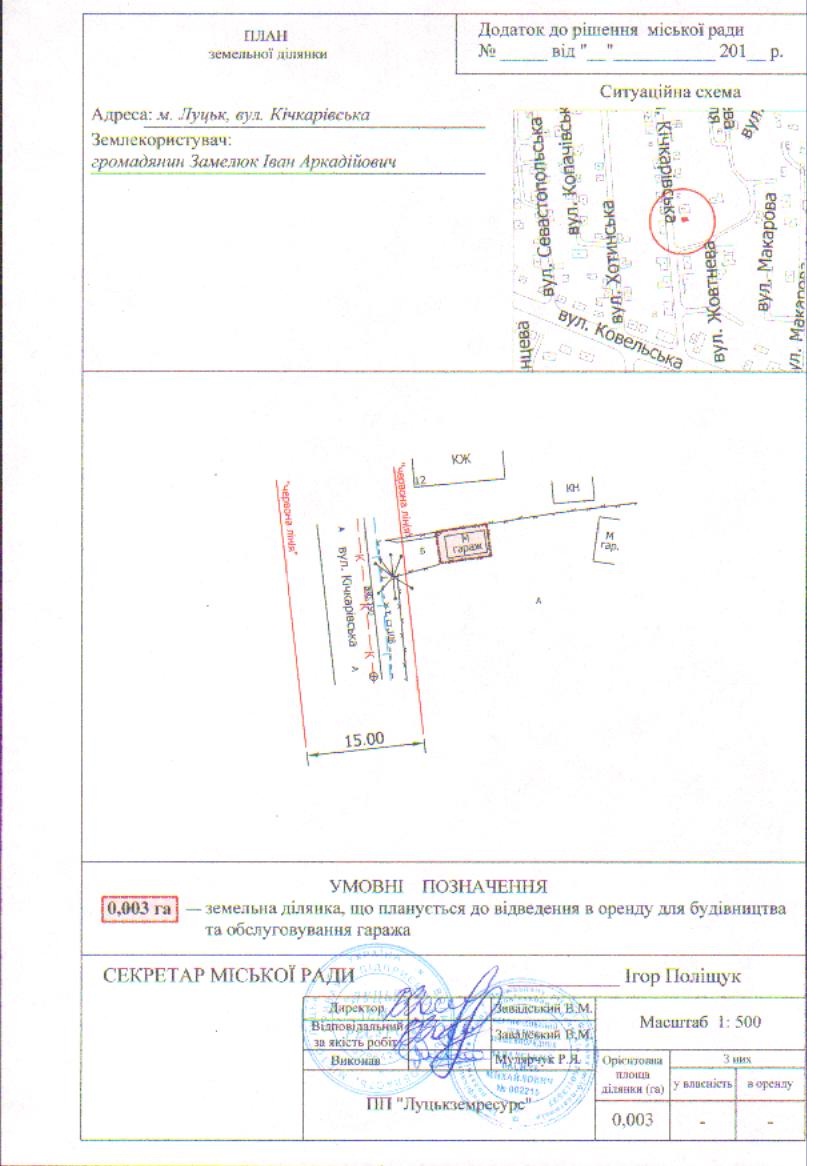 Розглянувши клопотання громадянина Замелюка Івана Аркадійовича про надання дозволу на розроблення проекту землеустрою щодо відведення земельної ділянки на вул. Кічкарівській для будівництва та обслуговування гаража, схему генплану земельної ділянки з прикладеним листом управління містобудування та архітектури Луцької міської ради щодо режиму забудови даної території, визначеної для містобудівних потреб, встановлених у генеральному плані міста Луцька, враховуючи технічний паспорт на гараж від 08.02.2017, керуючись статтями 12, 79-1, 93, 123 Земельного кодексу України, статтями 6 Закону України «Про оренду землі», ст. 50 Закону України «Про землеустрій», Законом України «Про внесення змін до деяких законодавчих актів України щодо розмежування земель державної та комунальної власності», ст. 26 Закону України “Про місцеве самоврядування в Україні”, Законом України «Про регулювання містобудівної діяльності», міська рада