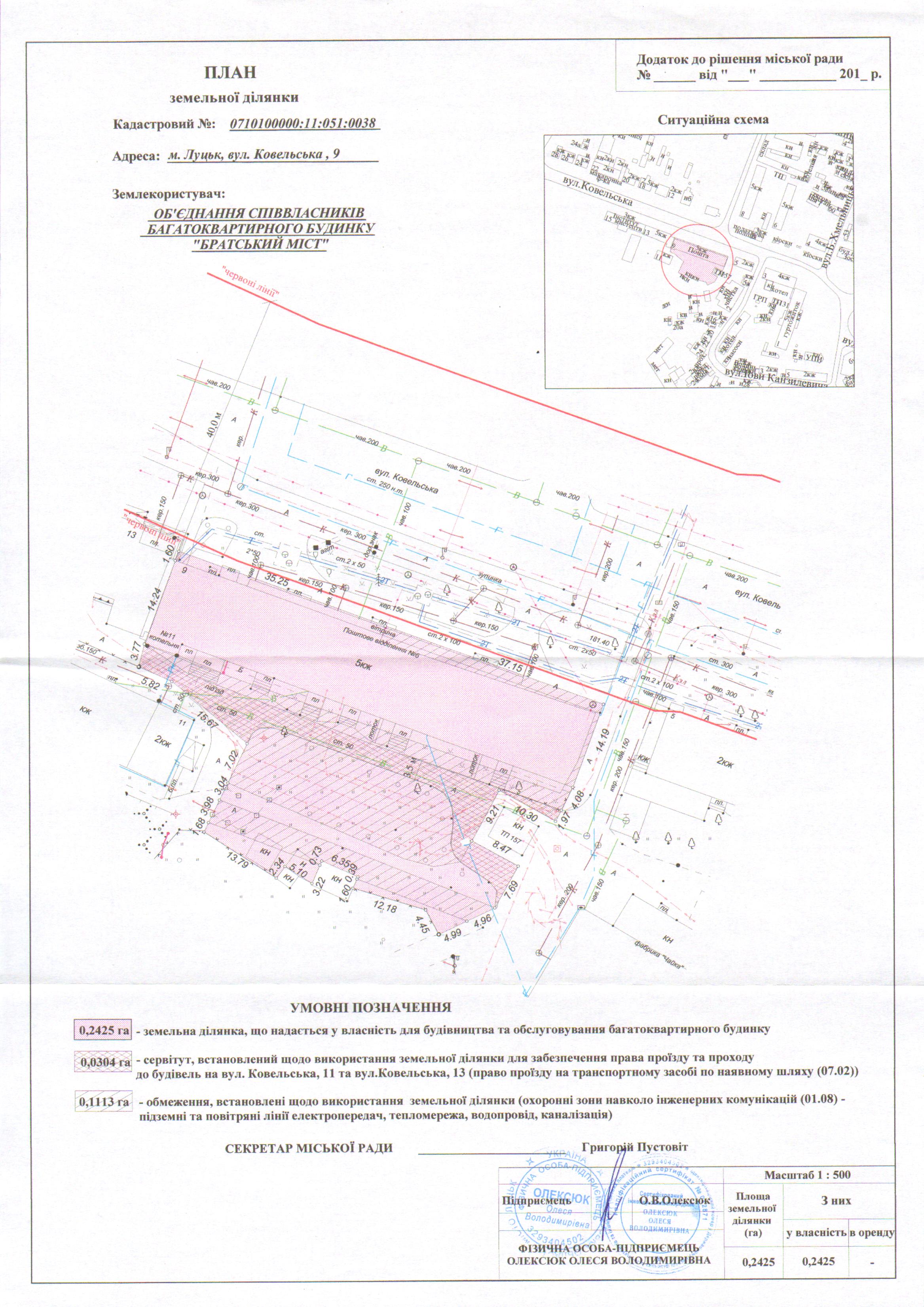1. Затвердити ОБ’ЄДНАННЮ СПІВВЛАСНИКІВ БАГАТОКВАРТИР-НОГО БУДИНКУ «БРАТСЬКИЙ МІСТ» проект землеустрою щодо відведення земельної ділянки площею 0,2425 га на вул. Ковельській, 9, кадастровим номером 0710100000:11:051:0038, для будівництва та обслуговування багатоквартирного будинку.
