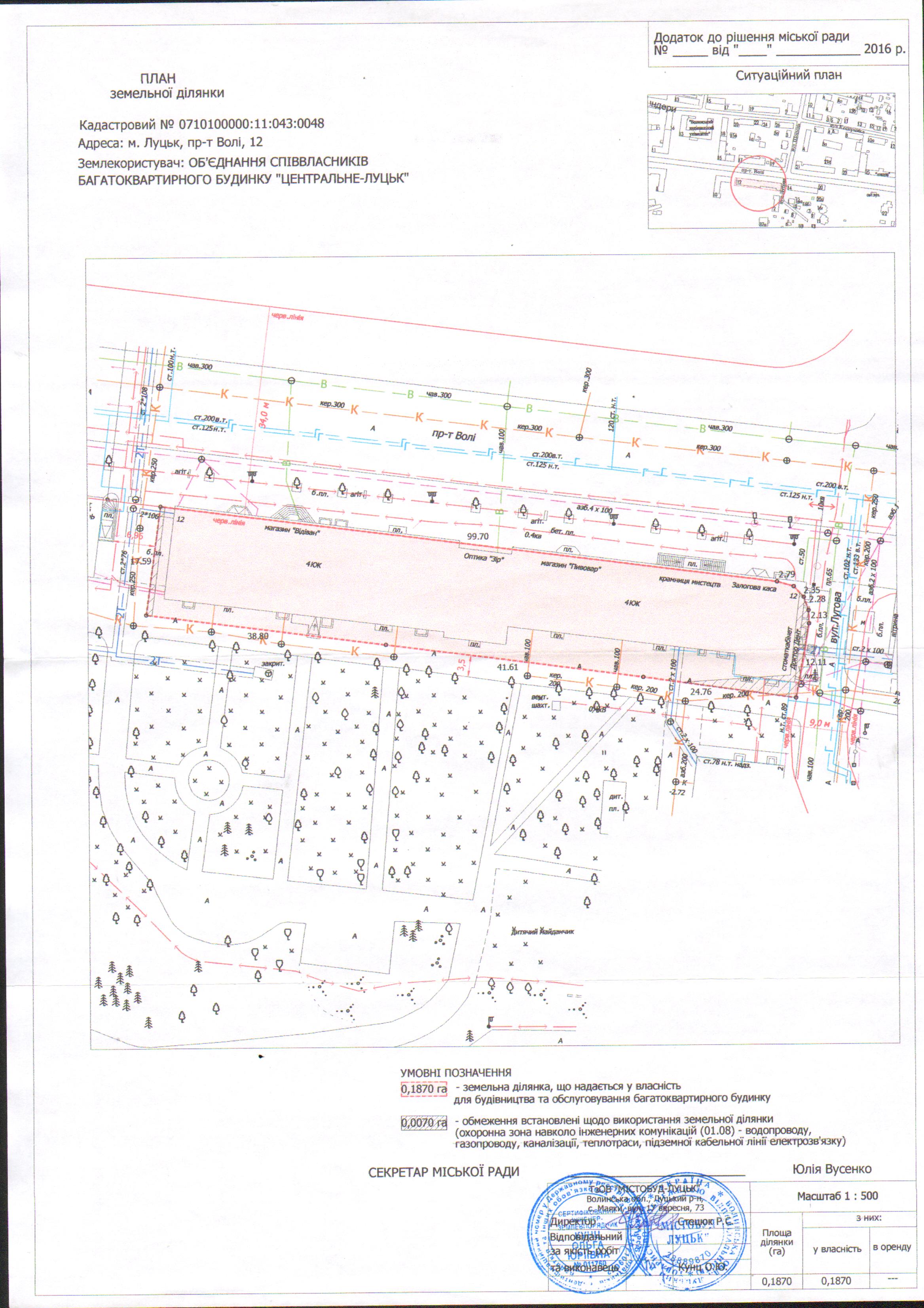1. Затвердити ОБ’ЄДНАННЮ СПІВВЛАСНИКІВ БАГАТОКВАРТИР-НОГО БУДИНКУ “ЦЕНТРАЛЬНЕ-ЛУЦЬК” проект землеустрою щодо відведення земельної ділянки площею 0,1870 га на проспекті Волі, 12, кадастровим номером 0710100000:11:043:0048, для будівництва та обслуговування багатоквартирного будинку.