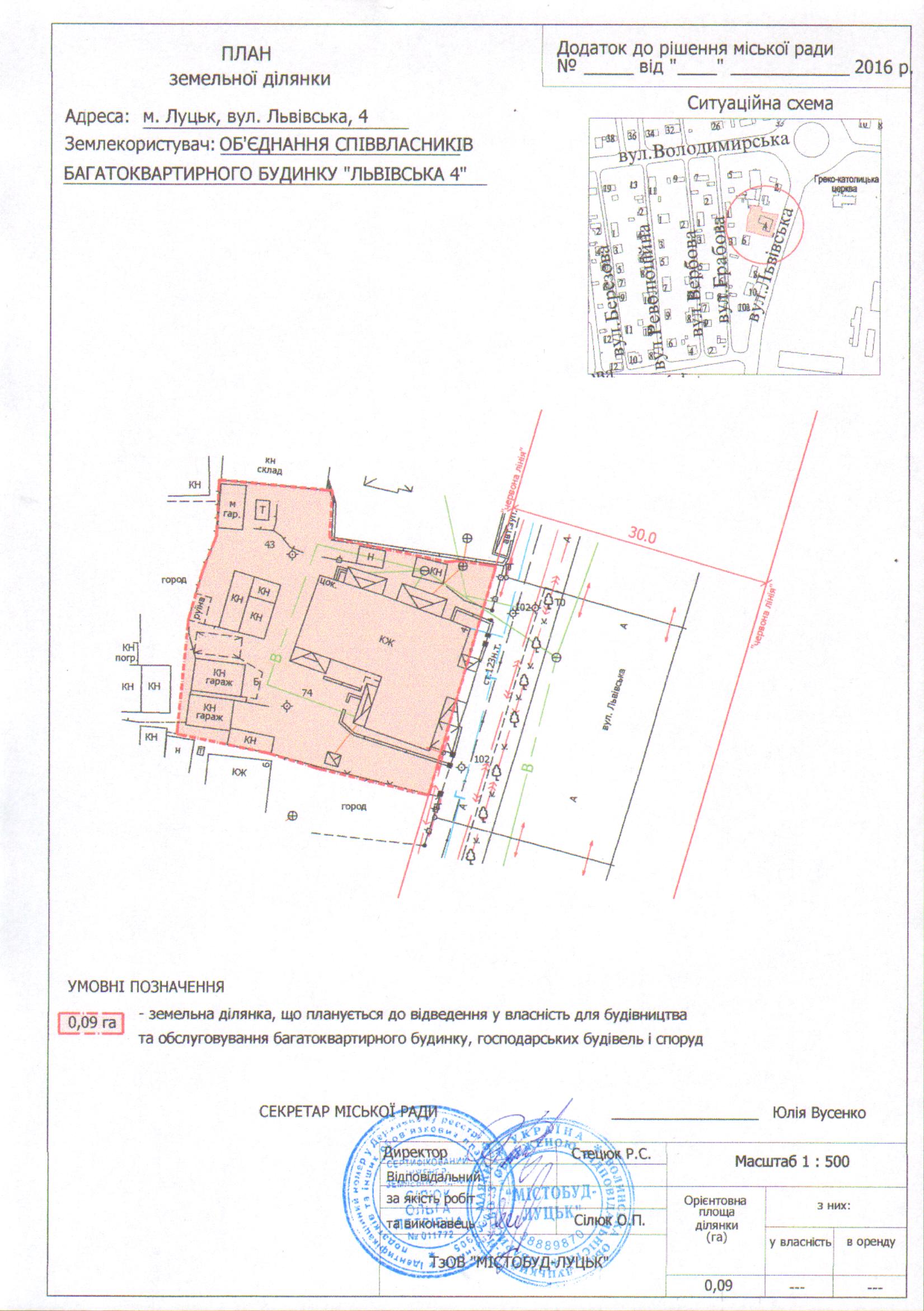 2. ОБ’ЄДНАННЮ СПІВВЛАСНИКІВ БАГАТОКВАРТИРНОГО БУДИНКУ «ЛЬВІВСЬКА 4» подати на затвердження розроблений проект землеустрою щодо відведення у власність земельної ділянки на вул. Львівській, 4 орієнтовною площею 0,09 га для будівництва та обслуговування багатоквартирного будинку, господарських будівель і споруд в порядку, визначеному чинним законодавством України.