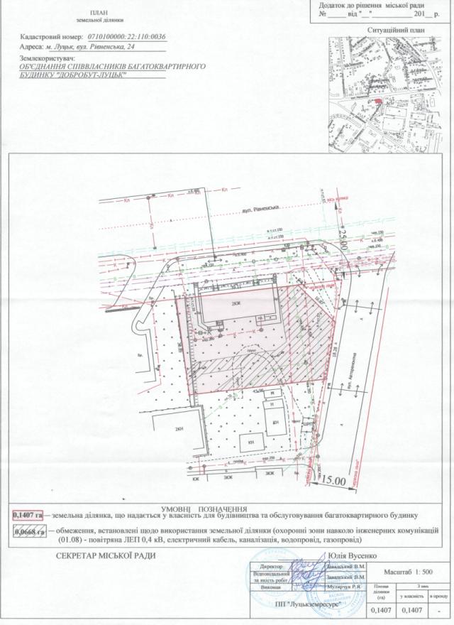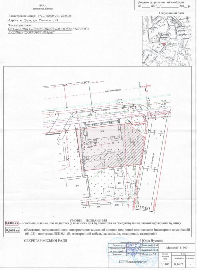 1. Затвердити ОБ’ЄДНАННЮ СПІВВЛАСНИКІВ БАГАТОКВАРТИР-НОГО БУДИНКУ «ДОБРОБУТ-ЛУЦЬК» проект землеустрою щодо відведення земельної ділянки площею 0,1407 га на вул. Рівненській, 24, кадастровим номером 0710100000:22:110:0036, для будівництва та обслуговування багатоквартирного будинку.