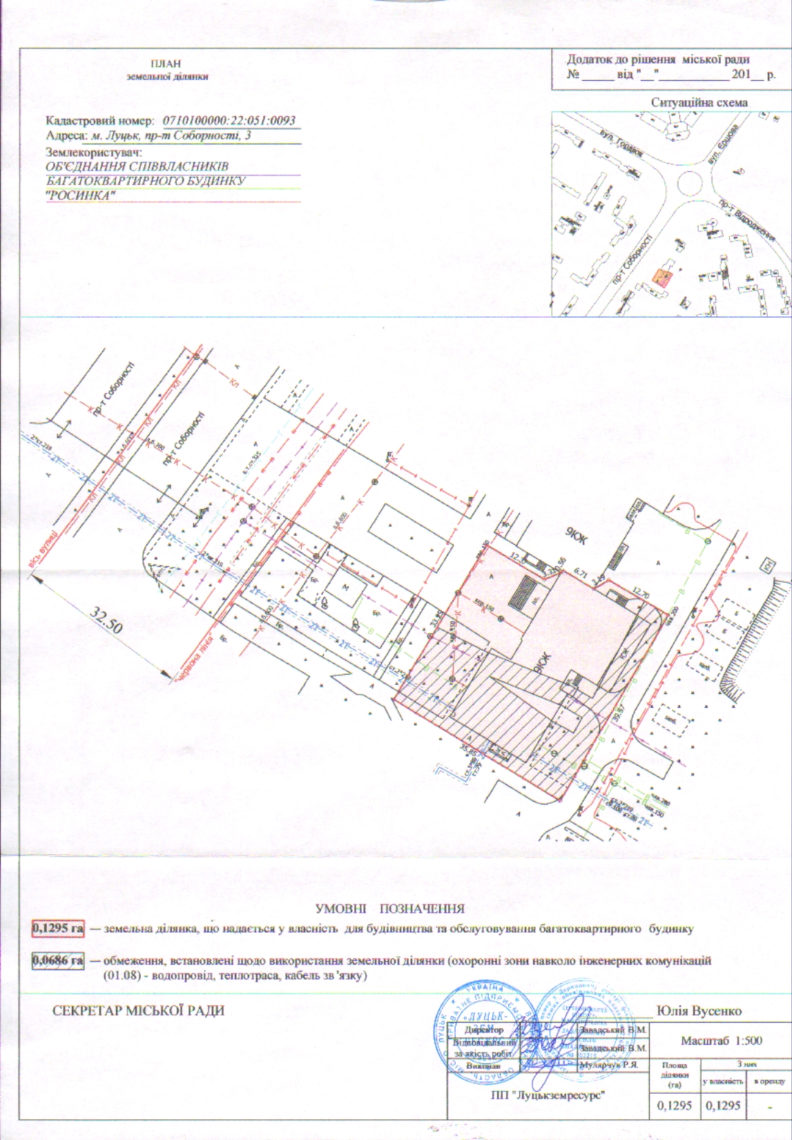 1. Затвердити ОБ’ЄДНАННЮ СПІВВЛАСНИКІВ БАГАТОКВАРТИРНОГО БУДИНКУ «РОСИНКА» проект землеустрою щодо відведення земельної ділянки площею 0,1295 га на пр-ті Соборності, 3, кадастровим номером 0710100000:22:051:0093, для будівництва та обслуговування багатоквартирного будинку.