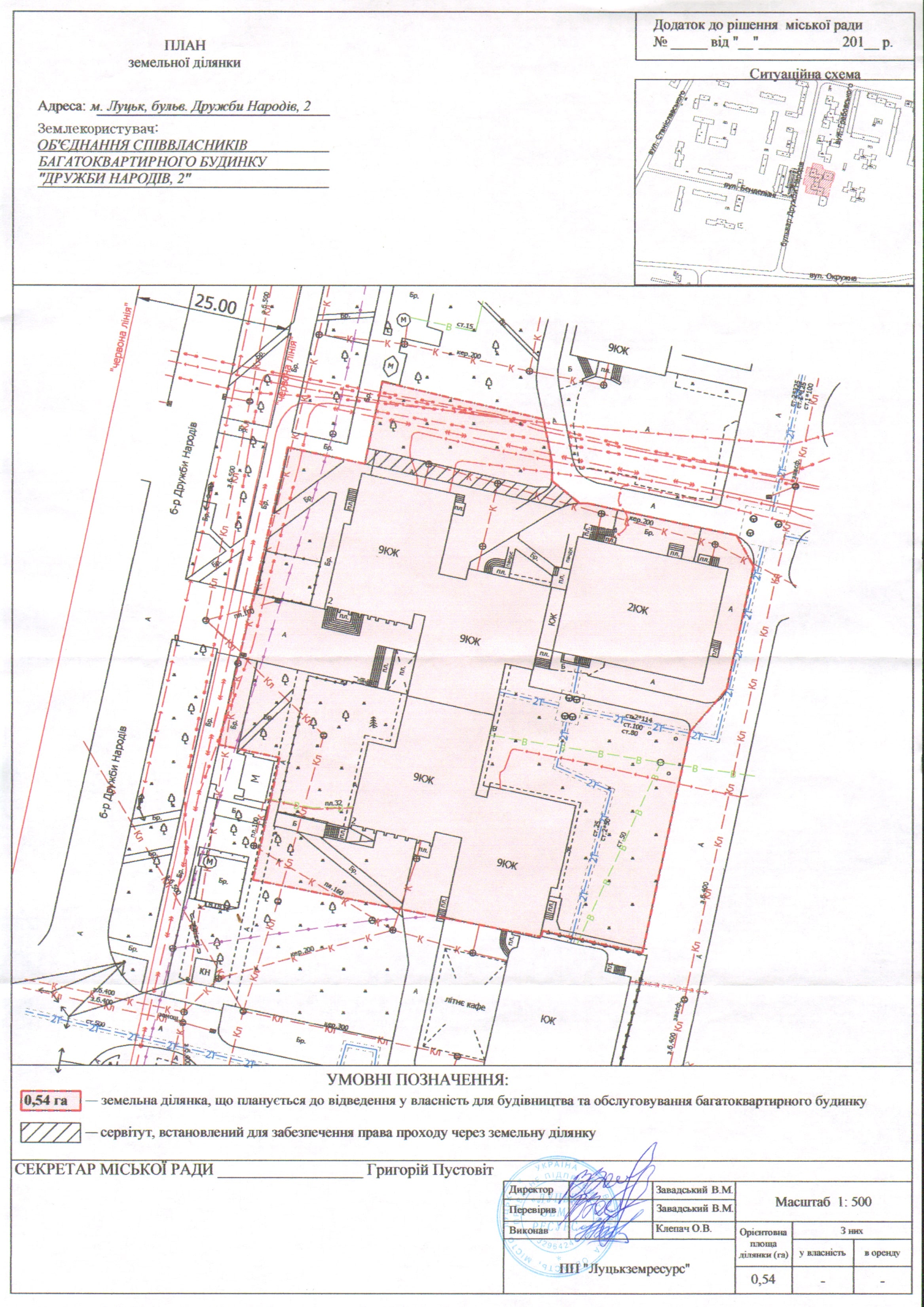2. ОБ’ЄДНАННЮ СПІВВЛАСНИКІВ БАГАТОКВАРТИРНОГО БУДИНКУ «ДРУЖБИ НАРОДІВ, 2» подати на затвердження розроблений проект землеустрою щодо відведення у власність земельної ділянки на бульварі Дружби Народів, 2 орієнтовною площею 0,54 га для будівництва та обслуговування багатоквартирного будинку в порядку, визначеному чинним законодавством України.