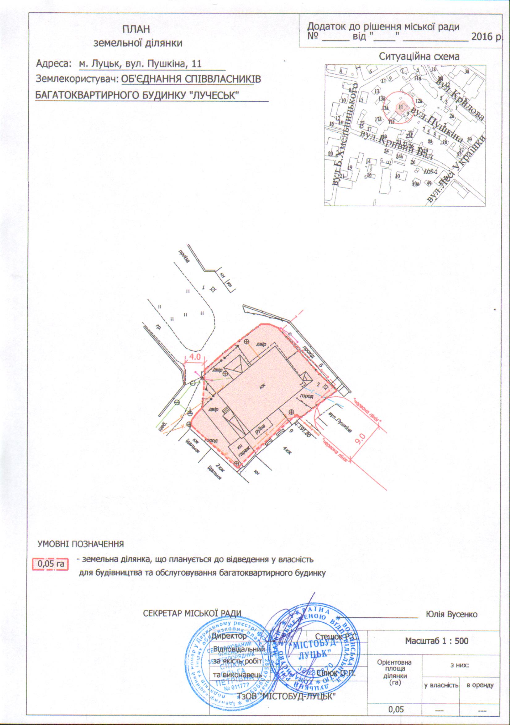 2. ОБ’ЄДНАННЮ СПІВВЛАСНИКІВ БАГАТОКВАРТИРНОГО БУДИНКУ «ЛУЧЕСЬК» подати на затвердження розроблений проект землеустрою щодо відведення у власність земельної ділянки на вул. Пушкіна, 11 орієнтовною площею 0,05 га для будівництва та обслуговування багатоквартирного будинку в порядку, визначеному чинним законодавством України.