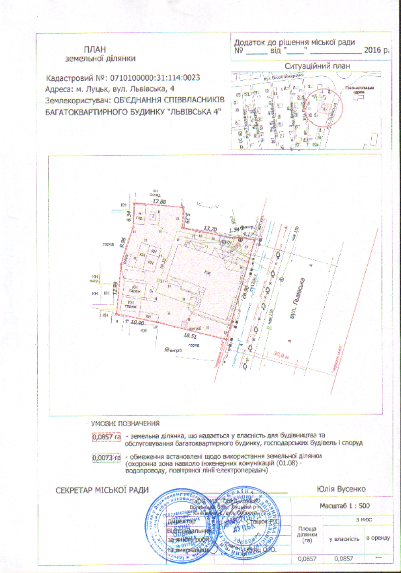 1. Затвердити ОБ’ЄДНАННЮ СПІВВЛАСНИКІВ БАГАТОКВАРТИР-НОГО БУДИНКУ «ЛЬВІВСЬКА 4» проект землеустрою щодо відведення земельної ділянки площею 0,0857 га на вул. Львівській, 4, кадастровим номером 0710100000:31:114:0023, для будівництва та обслуговування багатоквартирного будинку, господарських будівель і споруд.