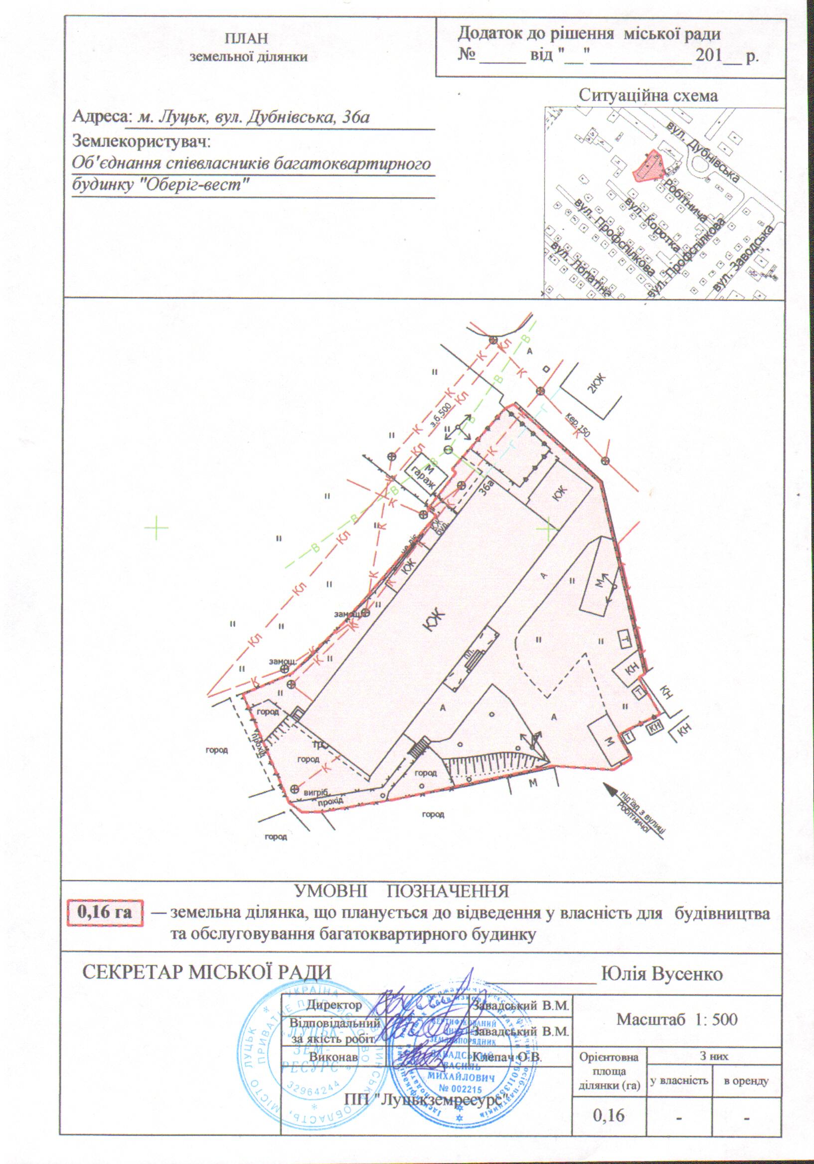2. Об’єднанню співвласників багатоквартирного будинку «Оберіг-вест» подати на затвердження розроблений проект землеустрою щодо відведення у власність земельної ділянки на вул. Дубнівській, 36а орієнтовною площею 0,16 га для будівництва та обслуговування багатоквартирного будинку в порядку, визначеному чинним законодавством України.