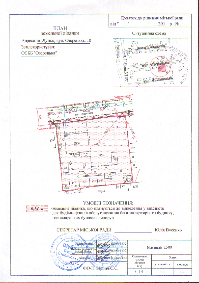 2. ОБ’ЄДНАННЮ СПІВВЛАСНИКІВ БАГАТОКВАРТИРНОГО БУДИНКУ «ОЗЕРЕЦЬКА» подати на затвердження розроблений проект землеустрою щодо відведення у власність земельної ділянки на вул. Озерецькій, 10 орієнтовною площею 0,14 га для будівництва та обслуговування багатоквартирного будинку, господарських будівель і споруд в порядку, визначеному чинним законодавством України.