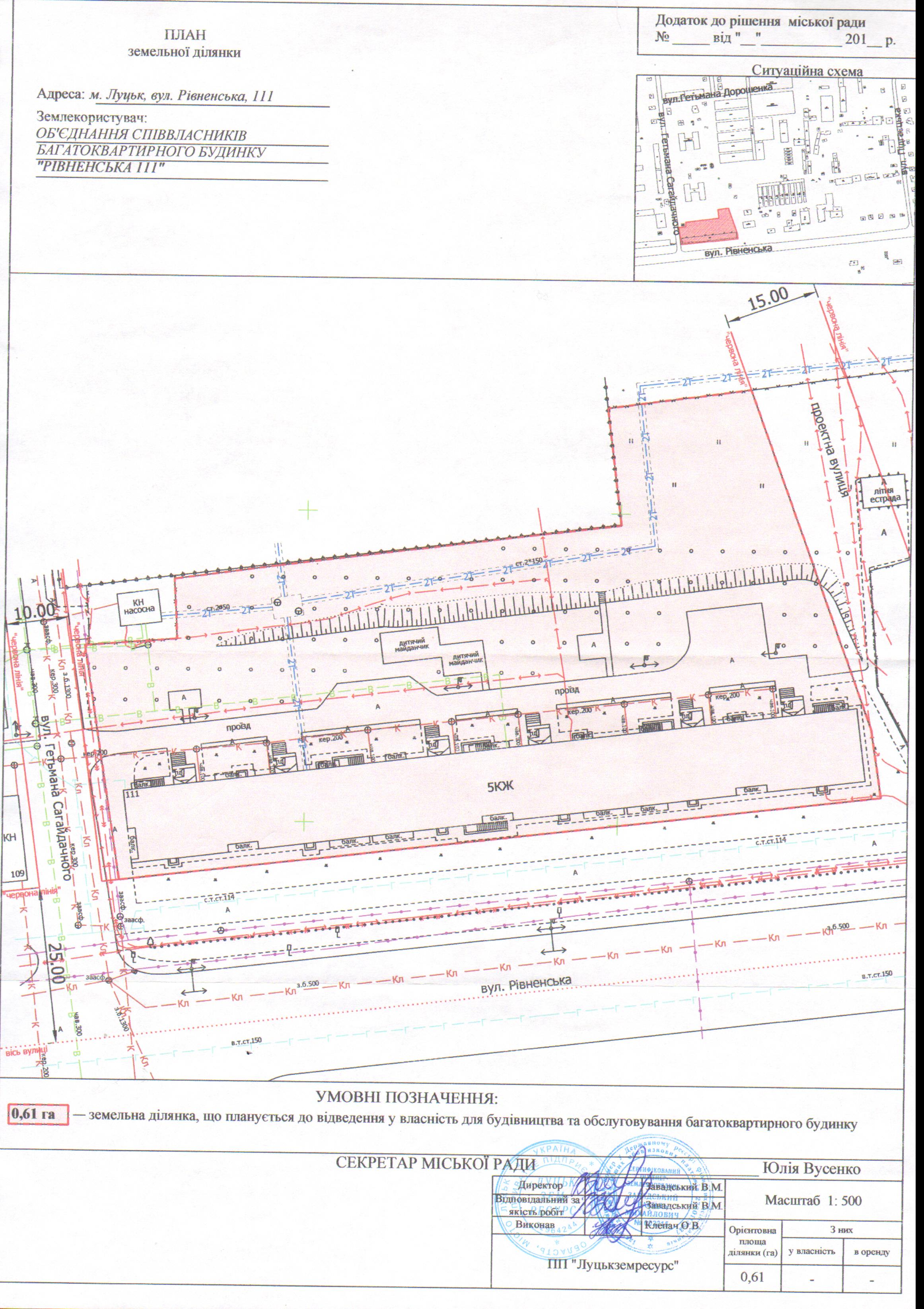 2. ОБ’ЄДНАННЮ СПІВВЛАСНИКІВ БАГАТОКВАРТИРНОГО БУДИНКУ «РІВНЕНСЬКА 111» подати на затвердження розроблений проект землеустрою щодо відведення у власність земельної ділянки на вул. Рівненській, 111 орієнтовною площею 0,61 га для будівництва та обслуговування багатоквартирного будинку в порядку, визначеному чинним законодавством України.