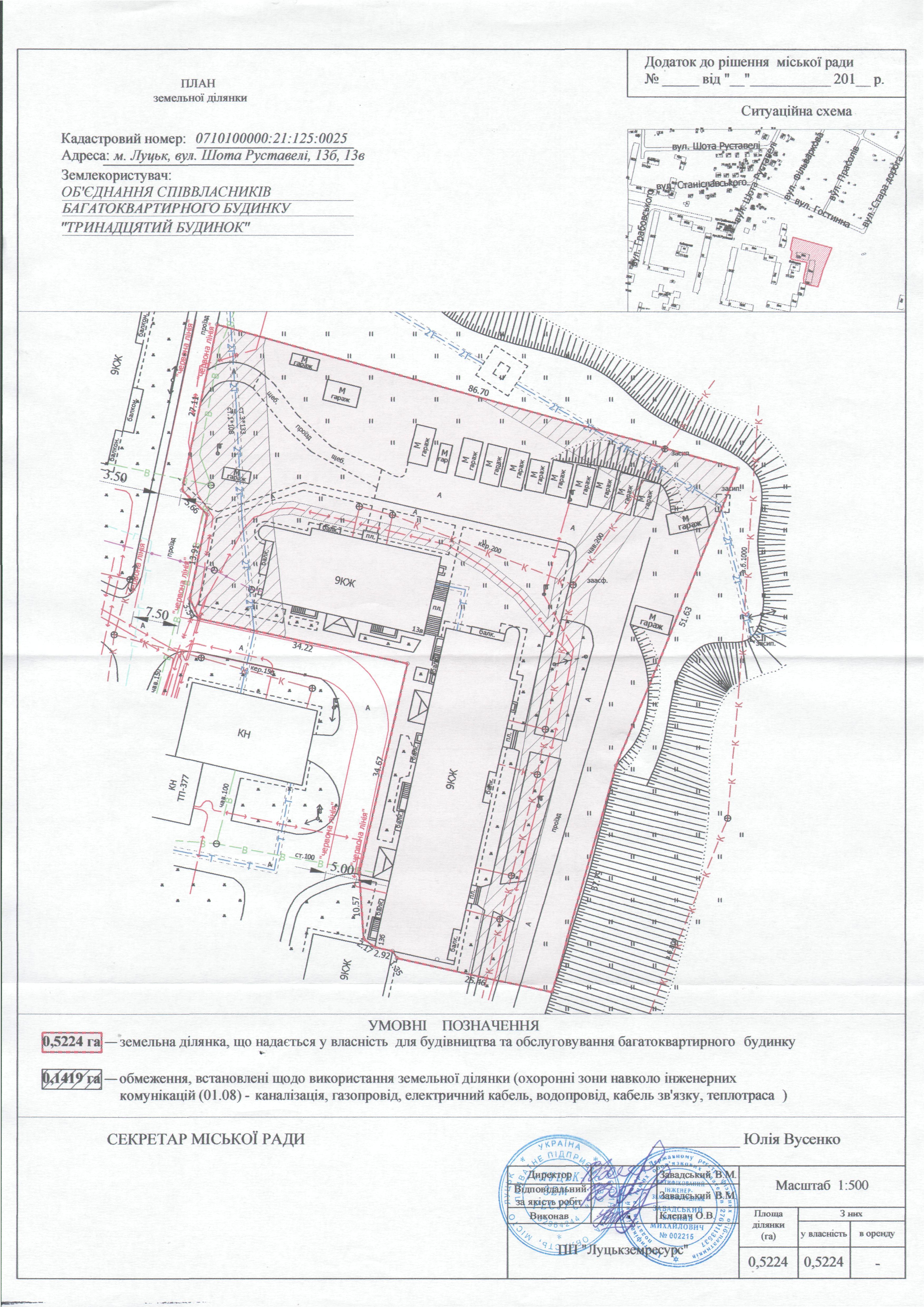 2. Надати ОБ’ЄДНАННЮ СПІВВЛАСНИКІВ БАГАТОКВАРТИРНОГО БУДИНКУ «ТРИНАДЦЯТИЙ БУДИНОК» у власність земельну ділянку площею 0,5224 га на вул. Шота Руставелі, 13б, 13в, кадастровим номером 0710100000:21:125:0025, для будівництва та обслуговування багатоквартирного будинку, згідно з додатком.