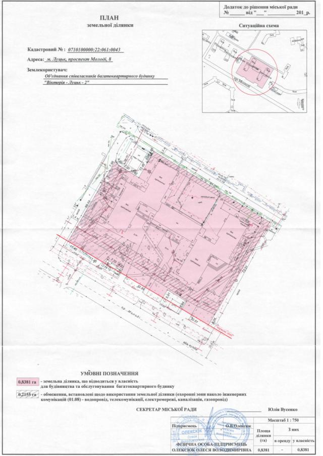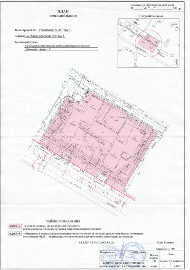 2. Надати об’єднанню співвласників багатоквартирного будинку «Вікторія-Луцьк-2» у власність земельну ділянку площею 0,8381 га на пр-ті Молоді, 8, кадастровим номером 0710100000:22:061:0043, для будівництва та обслуговування багатоквартирного будинку, згідно з додатком.