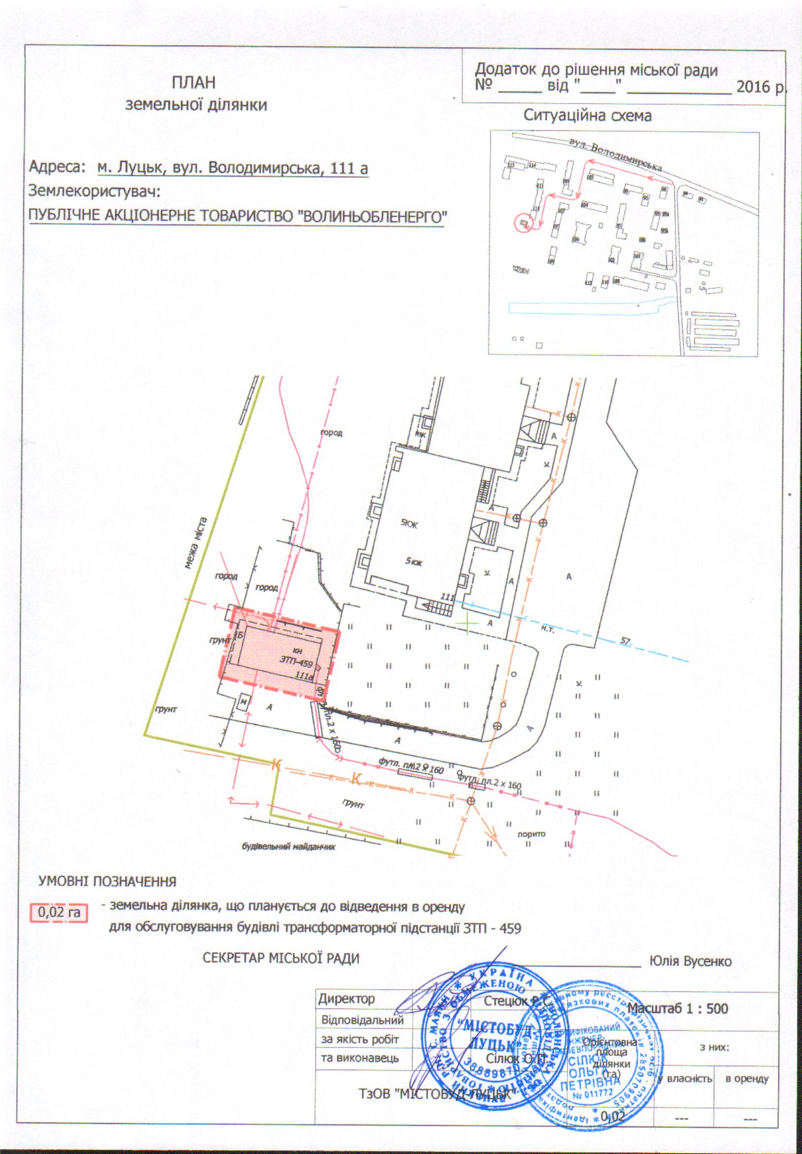 1. Надати ПУБЛІЧНОМУ АКЦІОНЕРНОМУ ТОВАРИСТВУ «ВОЛИНЬОБЛЕНЕРГО» дозвіл на розроблення проекту землеустрою щодо відведення земельної ділянки на умовах оренди для обслуговування будівлі трансформаторної підстанції ЗТП-459 на вул. Володимирській, 111а орієнтовною площею 0,02 га, з земель комунальної власності, згідно з додатком.