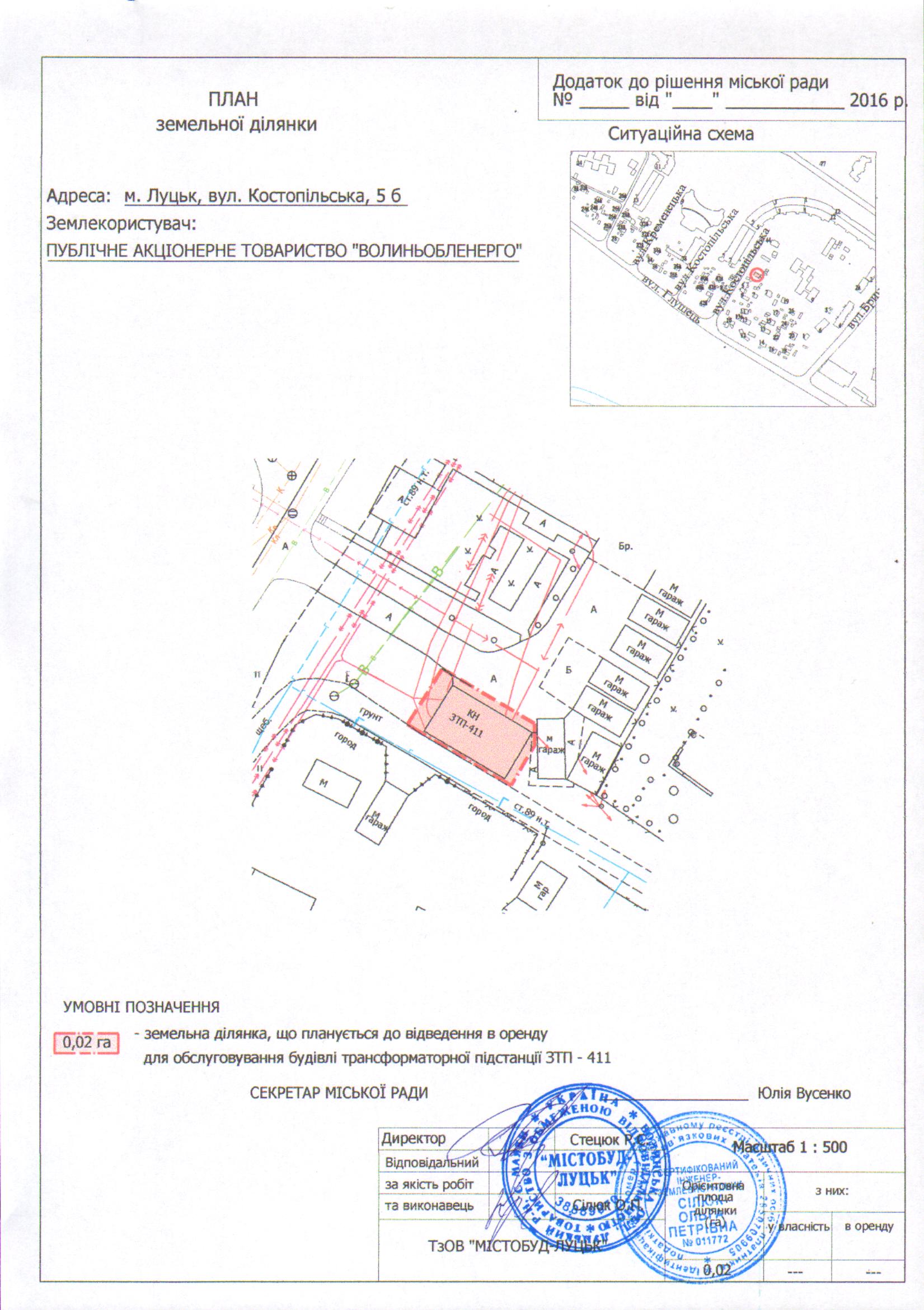 1. Надати ПУБЛІЧНОМУ АКЦІОНЕРНОМУ ТОВАРИСТВУ «ВОЛИНЬОБЛЕНЕРГО» дозвіл на розроблення проекту землеустрою щодо відведення земельної ділянки на умовах оренди для обслуговування будівлі трансформаторної підстанції ЗТП-411 на вул. Костопільській, 5б орієнтовною площею 0,02 га, з земель комунальної власності, згідно з додатком.