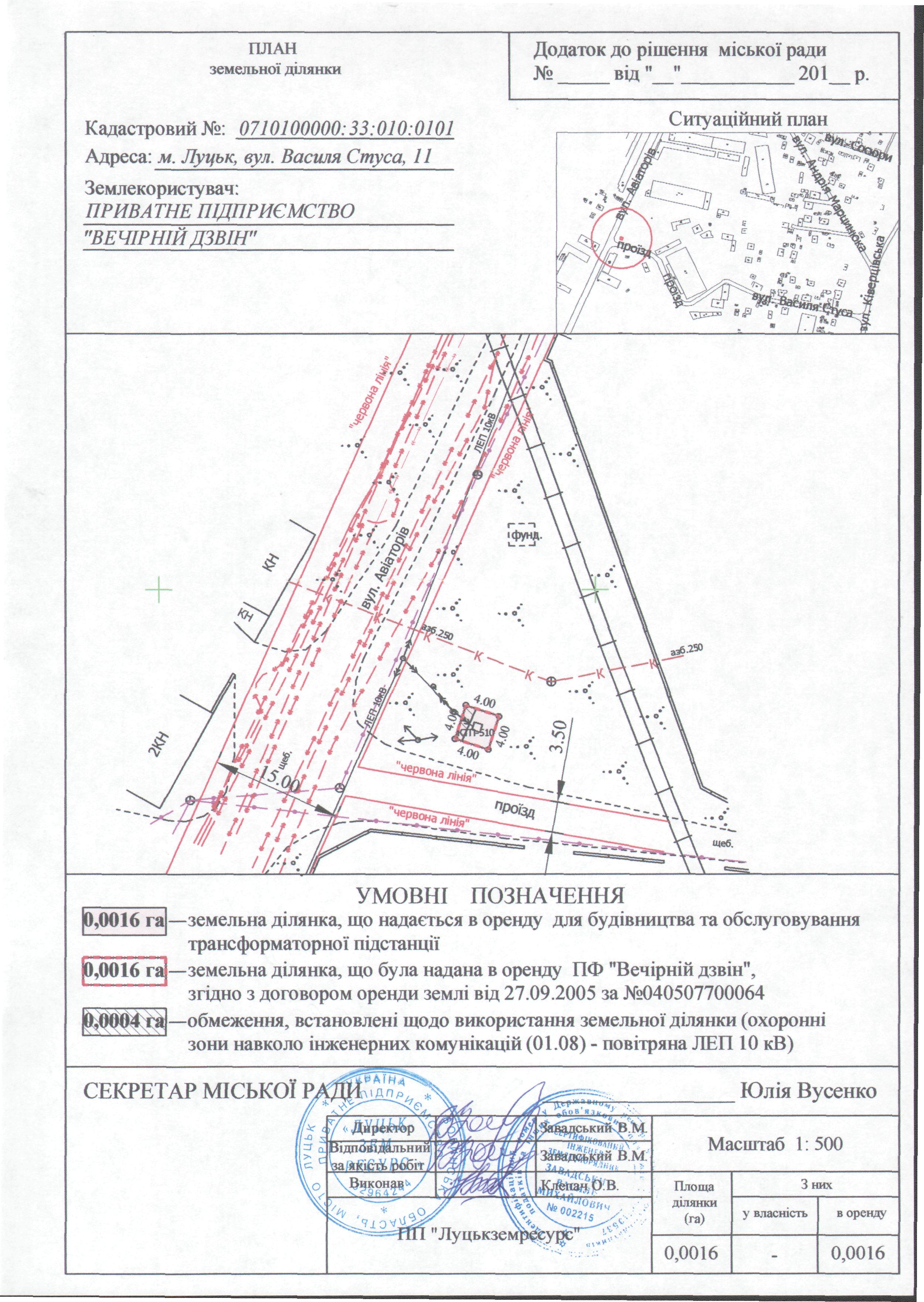 2. Надати ПРИВАТНОМУ ПІДПРИЄМСТВУ «ВЕЧІРНІЙ ДЗВІН» земельну ділянку на вул. Василя Стуса, 11, на умовах оренди строком на 10 років, площею 0,0016 га, кадастровим номером 0710100000:33:010:0101, для будівництва та обслуговування трансформаторної підстанції, згідно з додатком.