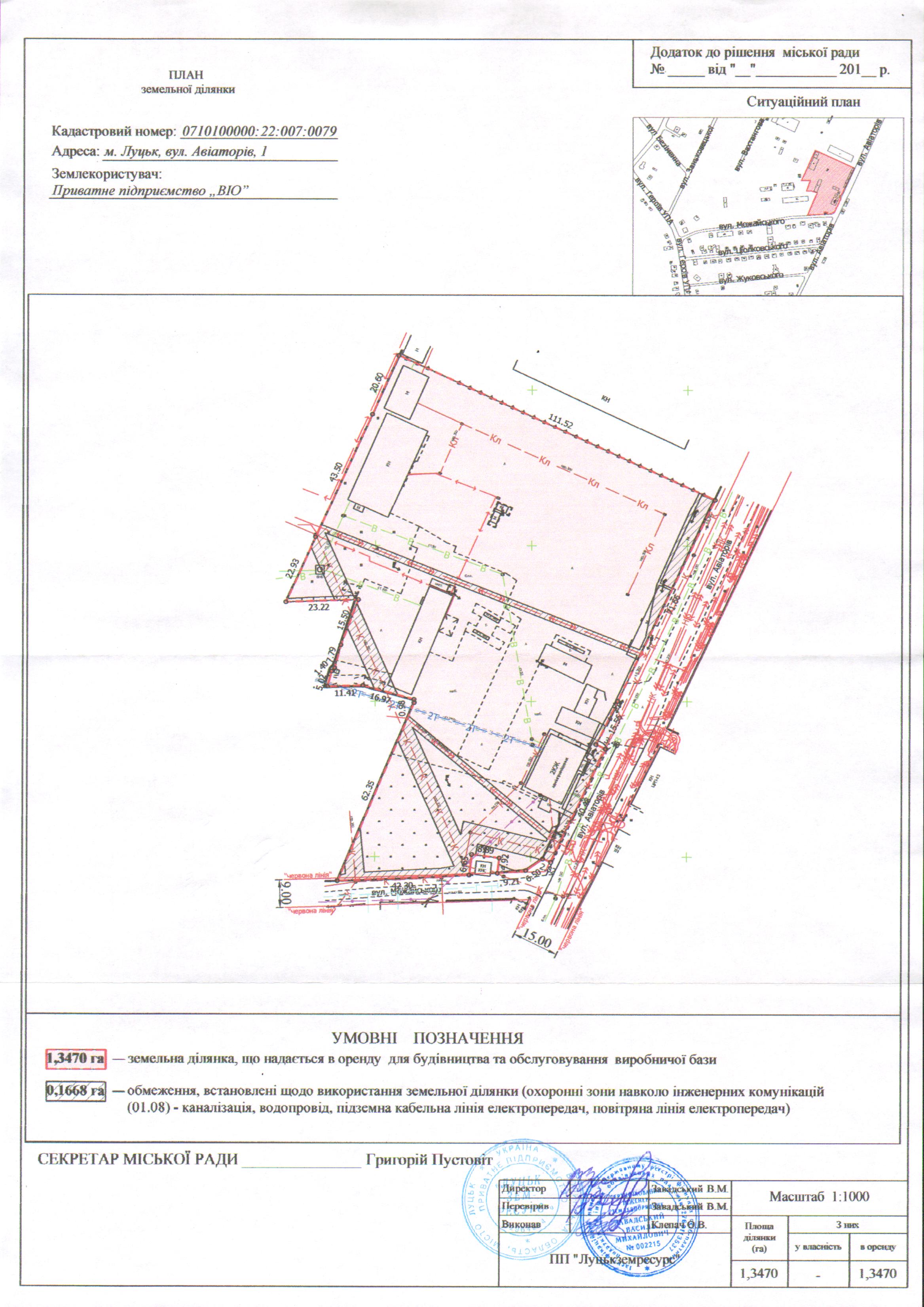 1. Затвердити Приватному підприємству «ВІО» технічну документацію із землеустрою щодо встановлення (відновлення) меж земельної ділянки в натурі (на місцевості) на вул. Авіаторів, 1, площею 1,3470 га, кадастровим номером 0710100000:22:007:0079, для будівництва та обслуговування виробничої бази.