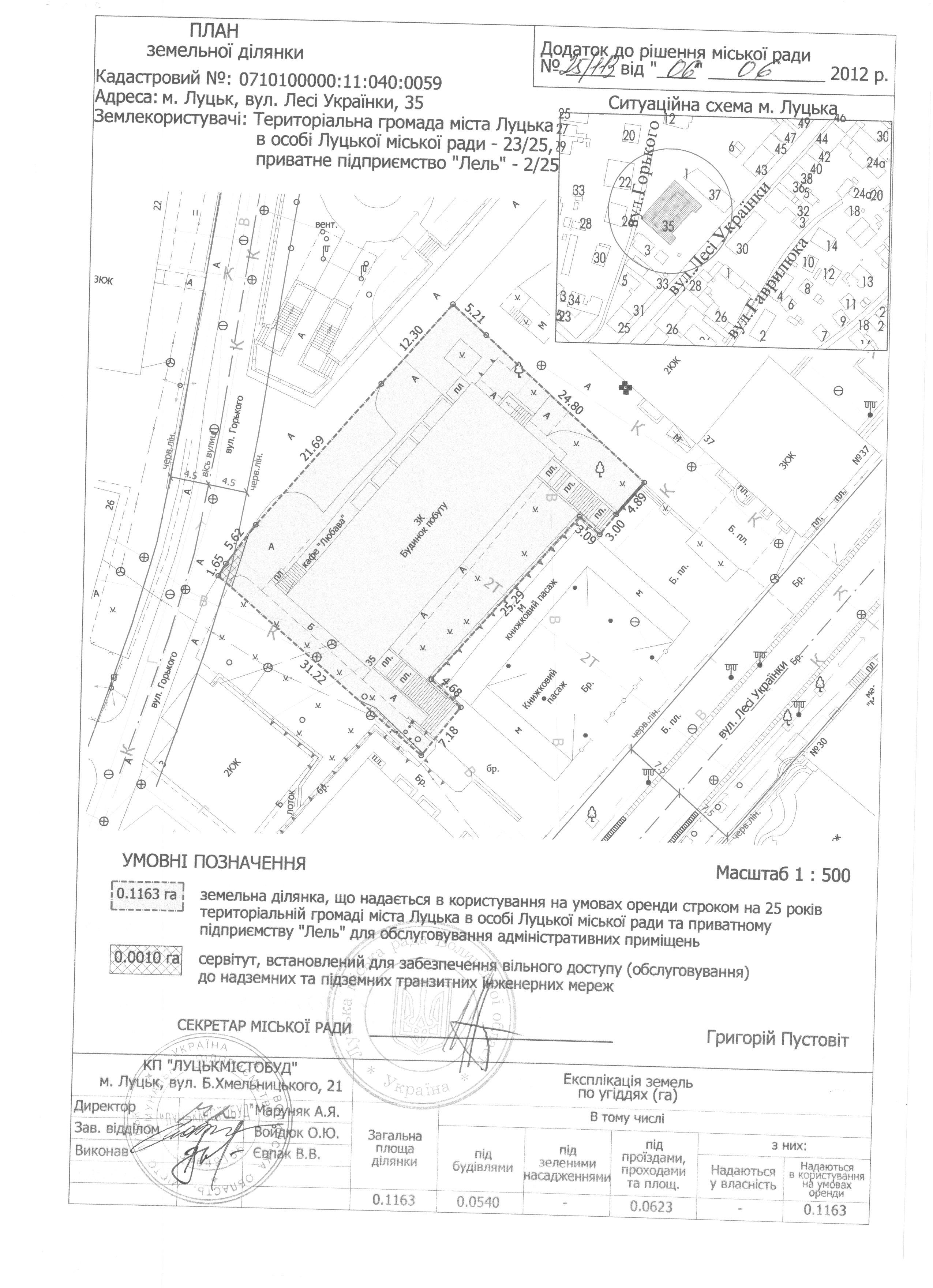 1. Затвердити територіальній громаді міста Луцька в особі Луцької міської ради та приватному підприємству «Лель» проект землеустрою щодо відведення земельної ділянки на вул. Лесі Українки, 35 площею 0,1163 га (частка територіальної громади міста Луцька в особі Луцької міської ради 23/25, що становить 0,1070 га, частка приватного підприємства «Лель» 2/25, що становить 0,0093 га) для обслуговування адміністративних приміщень.