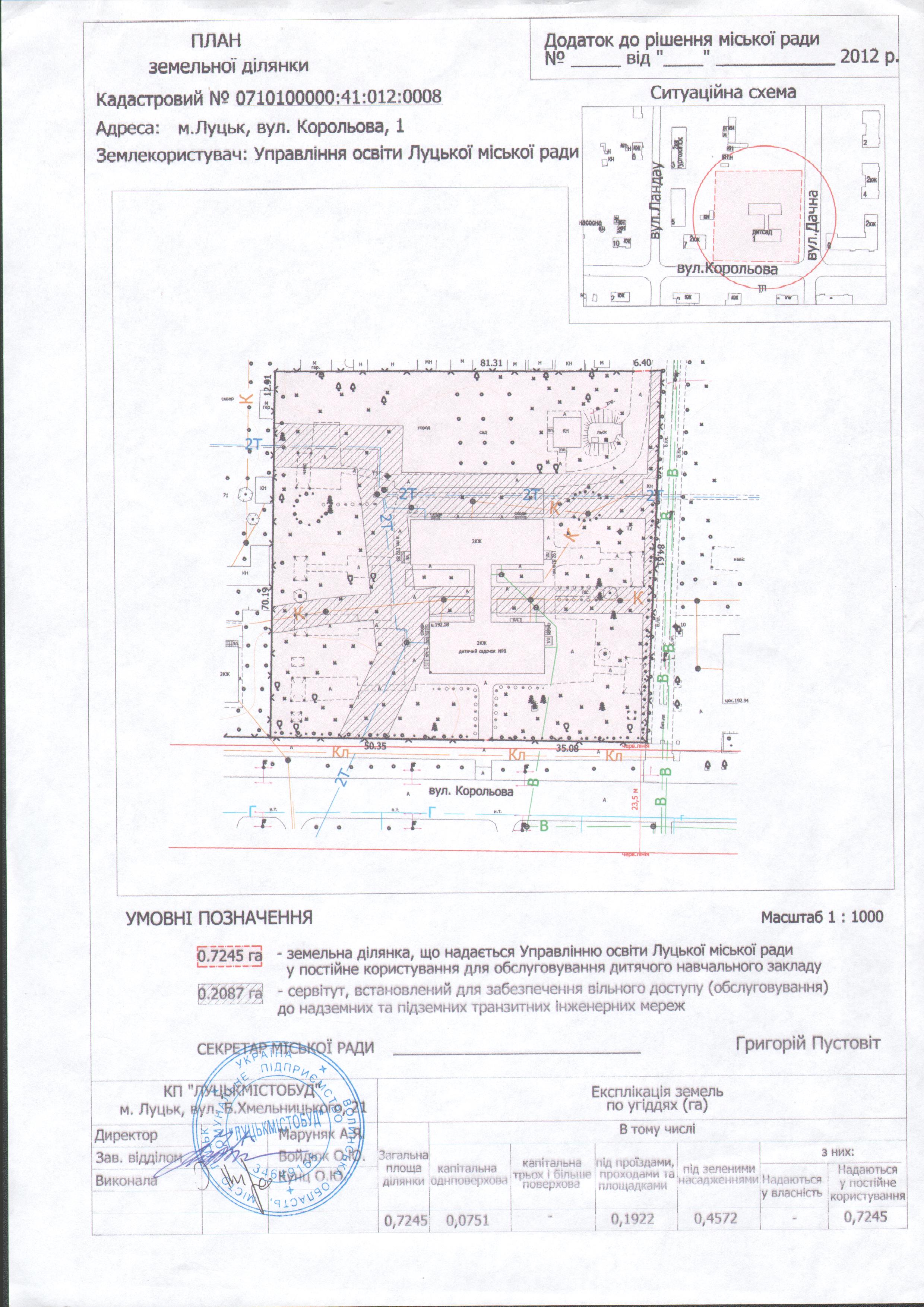 1. Затвердити територіальній громаді міста Луцька в особі Луцької міської ради (управління освіти Луцької міської ради) проект землеустрою щодо відведення земельної ділянки на вул. Корольова, 1 площею 0,7245 га кадастровим номером 0710100000:41:012:0008 для обслуговування дитячого навчального закладу.