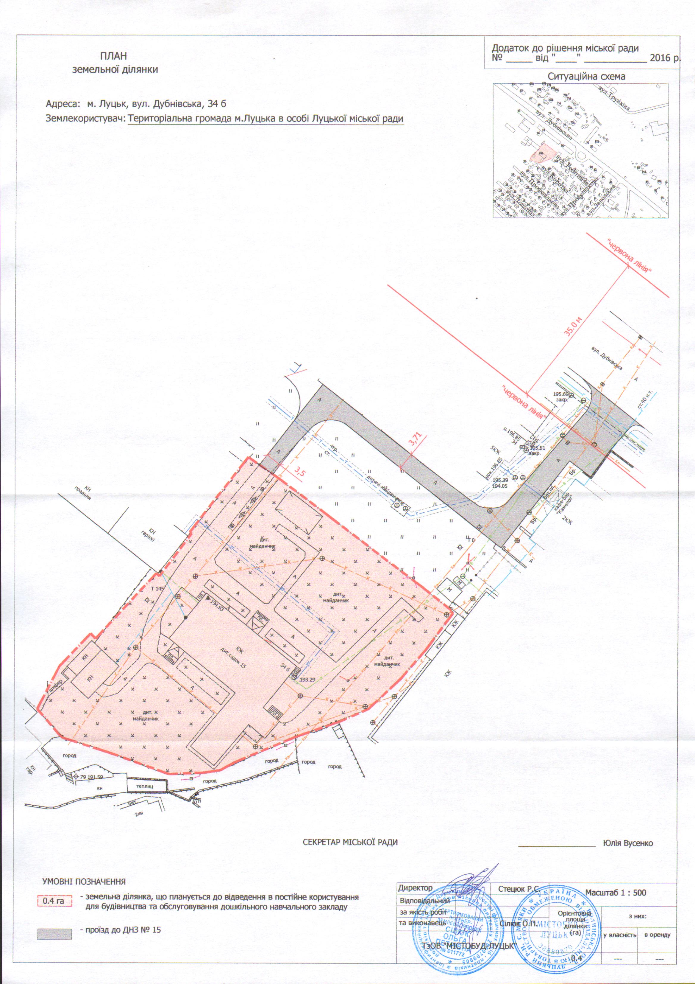2. Територіальній громаді міста Луцька в особі Луцької міської ради подати на затвердження розроблений проект землеустрою щодо відведення земельної ділянки на вул. Дубнівській, 34б, орієнтовною площею 0,4 га, для будівництва та обслуговування дошкільного навчального закладу, в порядку, визначеному чинним законодавством України.