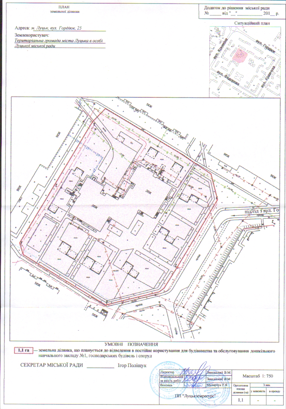 Розглянувши заяву Луцької міської ради про надання територіальній громаді міста Луцька в особі Луцької міської ради дозволу на розроблення проекту землеустрою щодо відведення земельної ділянки, орієнтовною площею 1,1 га для будівництва та обслуговування дошкільного навчального закладу №1, господарських будівель і споруд на вул. Гордіюк, 25, генплан земельної ділянки, лист управління містобудування та архітектури Луцької міської ради щодо режиму забудови даної території, визначеної для містобудівних потреб генеральним планом м. Луцька, технічний паспорт на об’єкти нерухомого майна, інформаційну довідку з Державного реєстру речових прав на нерухоме майно та Реєстру прав власності на нерухоме майно, Державного реєстру Іпотек, Єдиного реєстру заборон відчуження об`єктів нерухомого майна щодо об`єкта нерухомого майна, керуючись статтями 12, 92, 120, 123 Земельного кодексу України, п. 6 Прикінцевих та перехідних положень Закону України «Про внесення змін до деяких законодавчих актів України щодо розмежування земель державної та комунальної власності» та ст. 26 Закону України «Про місцеве самоврядування в Україні», міська рада