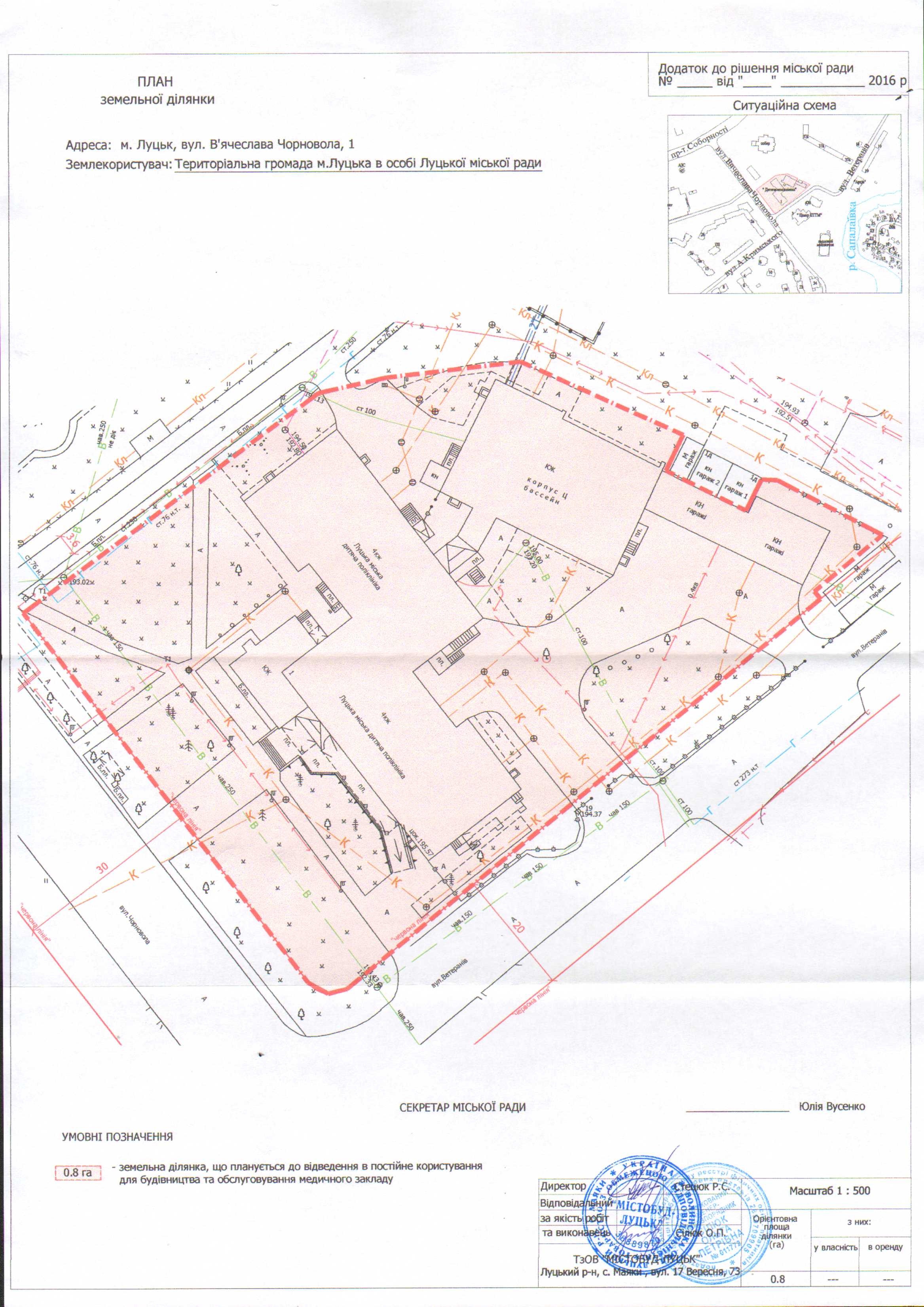 1. Надати територіальній громаді міста Луцька в особі Луцької міської ради дозвіл на розроблення проекту землеустрою щодо відведення земельної ділянки на вул. Чорновола, 1, орієнтовною площею 0,8 га, для будівництва та обслуговування медичного закладу, згідно з додатком.
