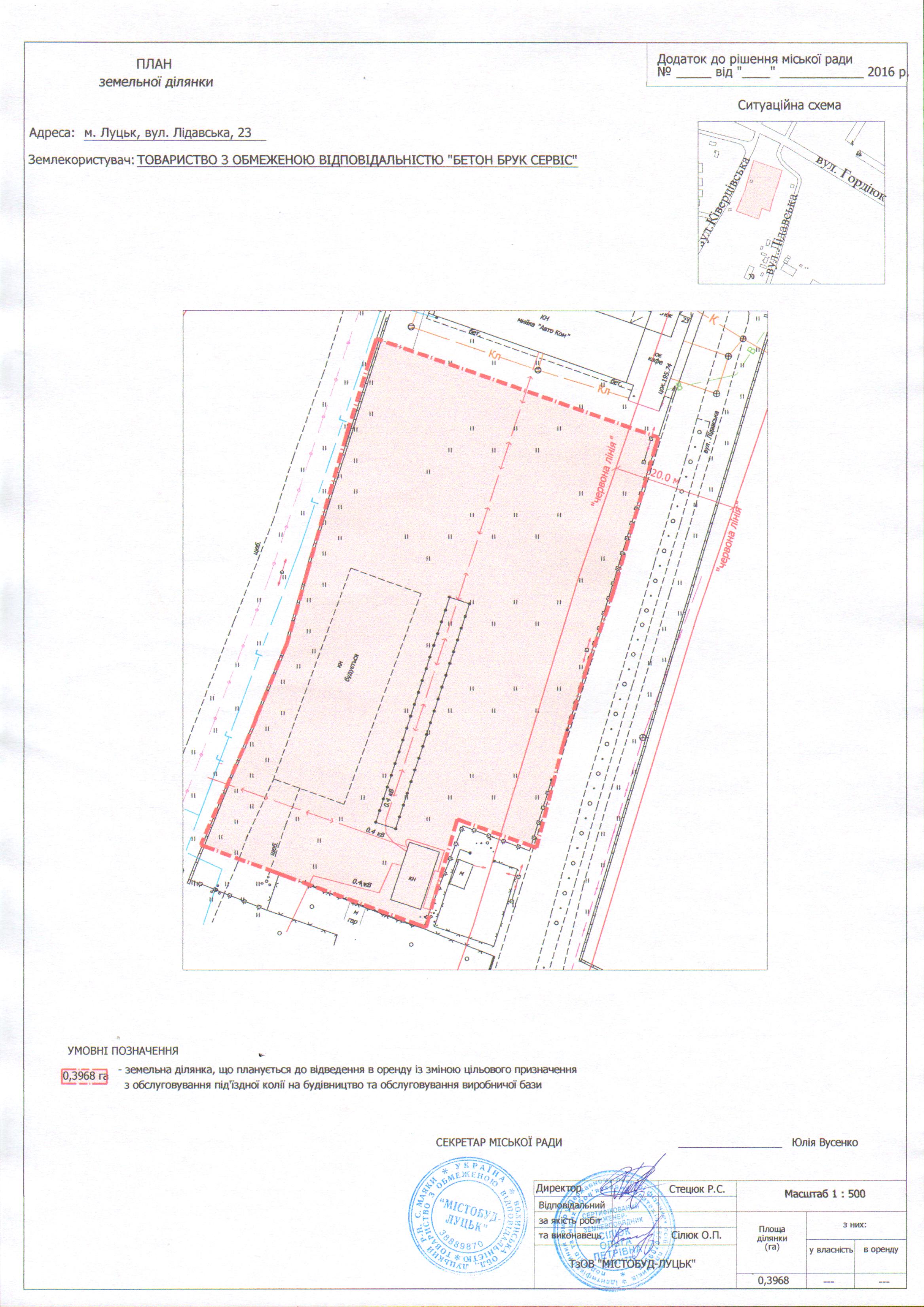 1. Надати ТОВАРИСТВУ З ОБМЕЖЕНОЮ ВІДПОВІДАЛЬНІСТЮ «БЕТОН БРУК СЕРВІС» дозвіл на розроблення проекту землеустрою щодо відведення земельної ділянки на умовах оренди на вул. Лідавській, 23, площею 0,3968 га, кадастровим номером 0710100000:22:034:0027, із зміною цільового призначення з обслуговування під'їздної колії на будівництво та обслуговування виробничої бази, з земель комунальної власності, згідно з додатком.