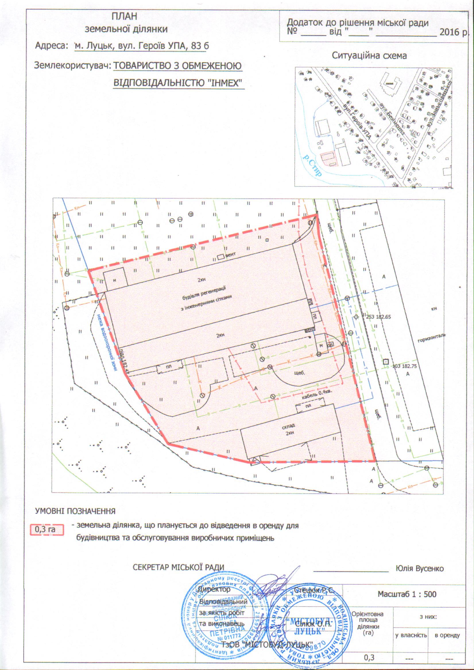 1. Надати ТОВАРИСТВУ З ОБМЕЖЕНОЮ ВІДПОВІДАЛЬНІСТЮ «ІНМЕХ» дозвіл на розроблення проекту землеустрою щодо відведення земельної ділянки на умовах оренди для будівництва та обслуговування виробничих приміщень на вул. Героїв УПА, 83б, орієнтовною площею 0,3 га, з земель комунальної власності, згідно з додатком.