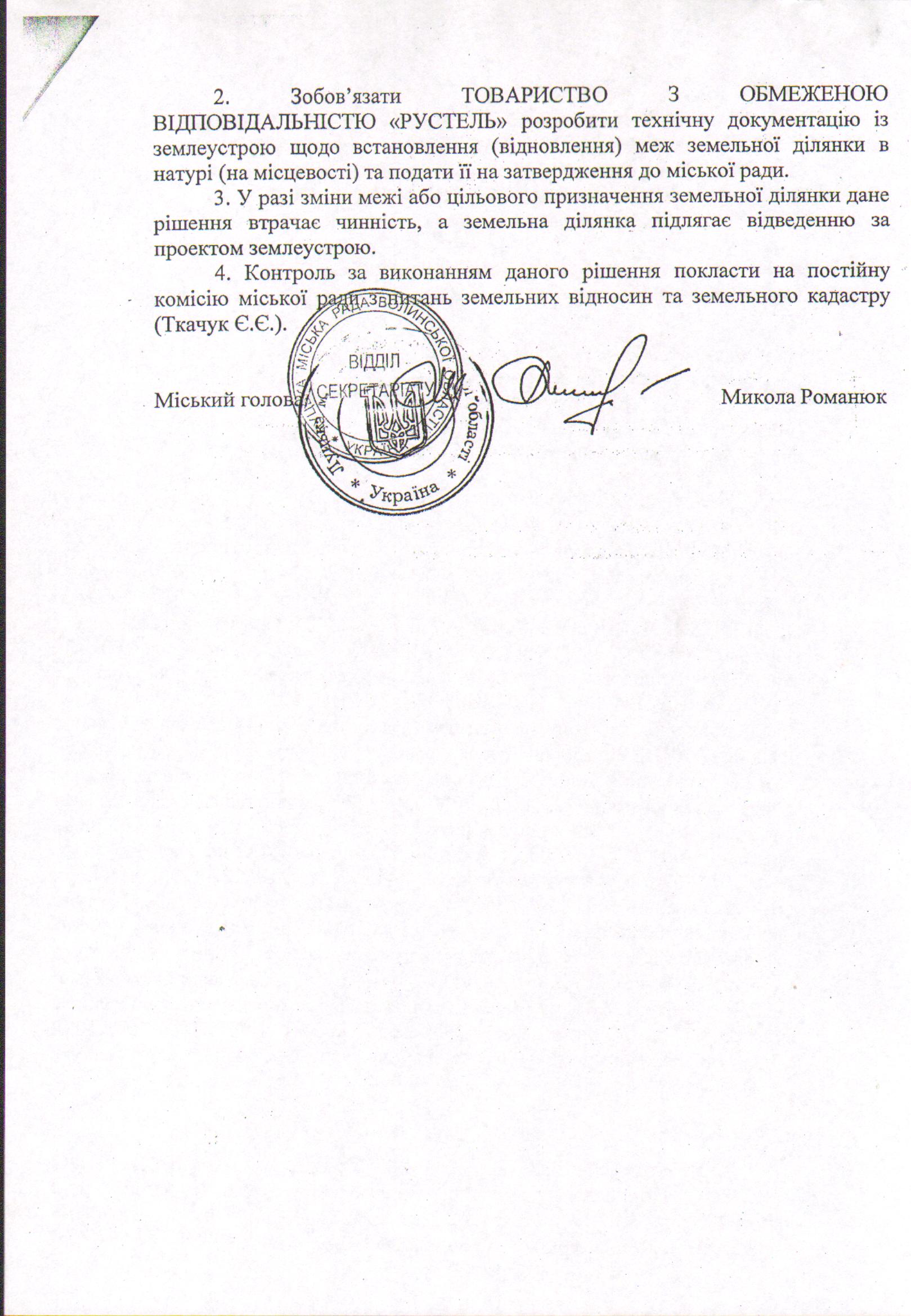 5. Контроль за виконанням даного рішення покласти на постійну комісію міської ради з питань земельних відносин та земельного кадастру (Ткачук Є.Є.).