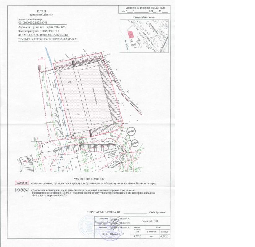 1. Затвердити ТОВАРИСТВУ З ОБМЕЖЕНОЮ ВІДПОВІДАЛЬНІСТЮ «ЛУЦЬКА КАРТОННО-ПАПЕРОВА ФАБРИКА» проект землеустрою щодо відведення земельної ділянки на вул. Героїв УПА, 85б площею 0,2920 га, кадастровим номером 0710100000:22:022:0048, для будівництва та обслуговування технічних будівель і споруд.