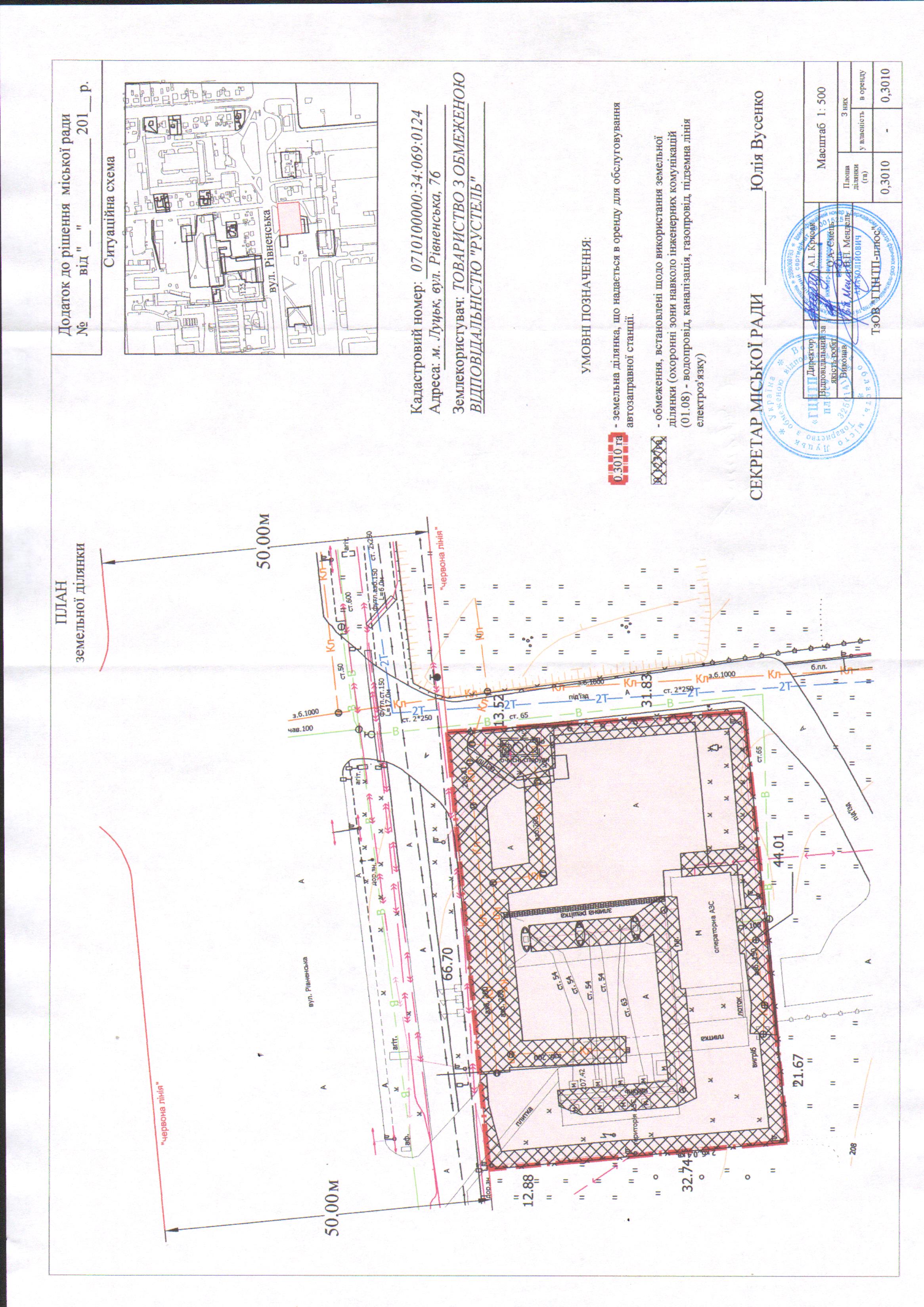 2. Надати ТОВАРИСТВУ З ОБМЕЖЕНОЮ ВІДПОВІДАЛЬНІСТЮ «РУСТЕЛЬ» земельну ділянку на вул. Рівненській, 76, на умовах оренди строком на 10 років, площею 0,3010 га, кадастровим номером 0710100000:34:069:0124, для обслуговування автозаправної станції, згідно з додатком.