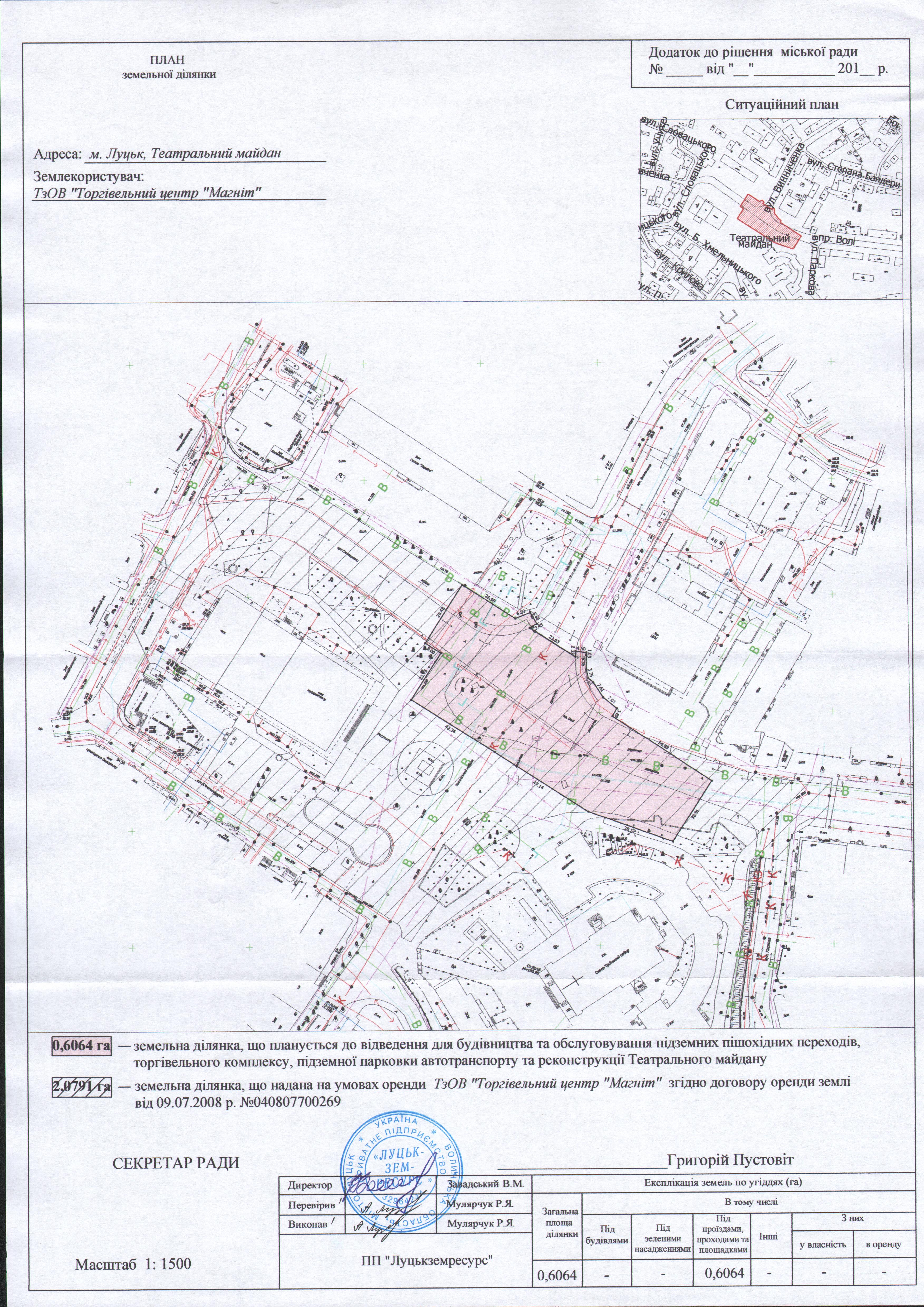 Розглянувши клопотання товариства з обмеженою відповідальністю «ТОРГІВЕЛЬНИЙ ЦЕНТР «МАГНІТ» про надання дозволу на розроблення проекту землеустрою щодо відведення земельної ділянки на Театральному майдані для будівництва та обслуговування підземних пішохідних переходів, торгівельного комплексу, підземної парковки автотранспорту та реконструкції Театрального майдану, погоджену схему генплану земельної ділянки, керуючись статтями 12, 123-124 Земельного кодексу України, ст. 26 Закону України “Про місцеве самоврядування в Україні”, міська рада