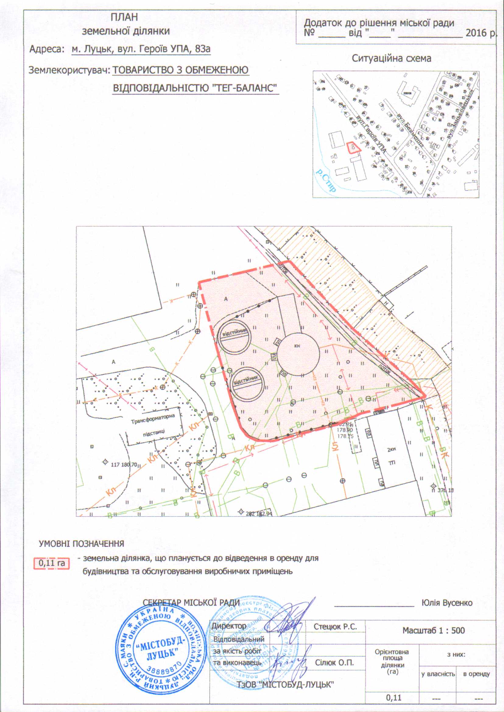 1. Надати ТОВАРИСТВУ З ОБМЕЖЕНОЮ ВІДПОВІДАЛЬНІСТЮ «ТЕГ-БАЛАНС» дозвіл на розроблення проекту землеустрою щодо відведення земельної ділянки на умовах оренди для будівництва та обслуговування виробничих приміщень на вул. Героїв УПА, 83а, орієнтовною площею 0,11 га, з земель комунальної власності, згідно з додатком.