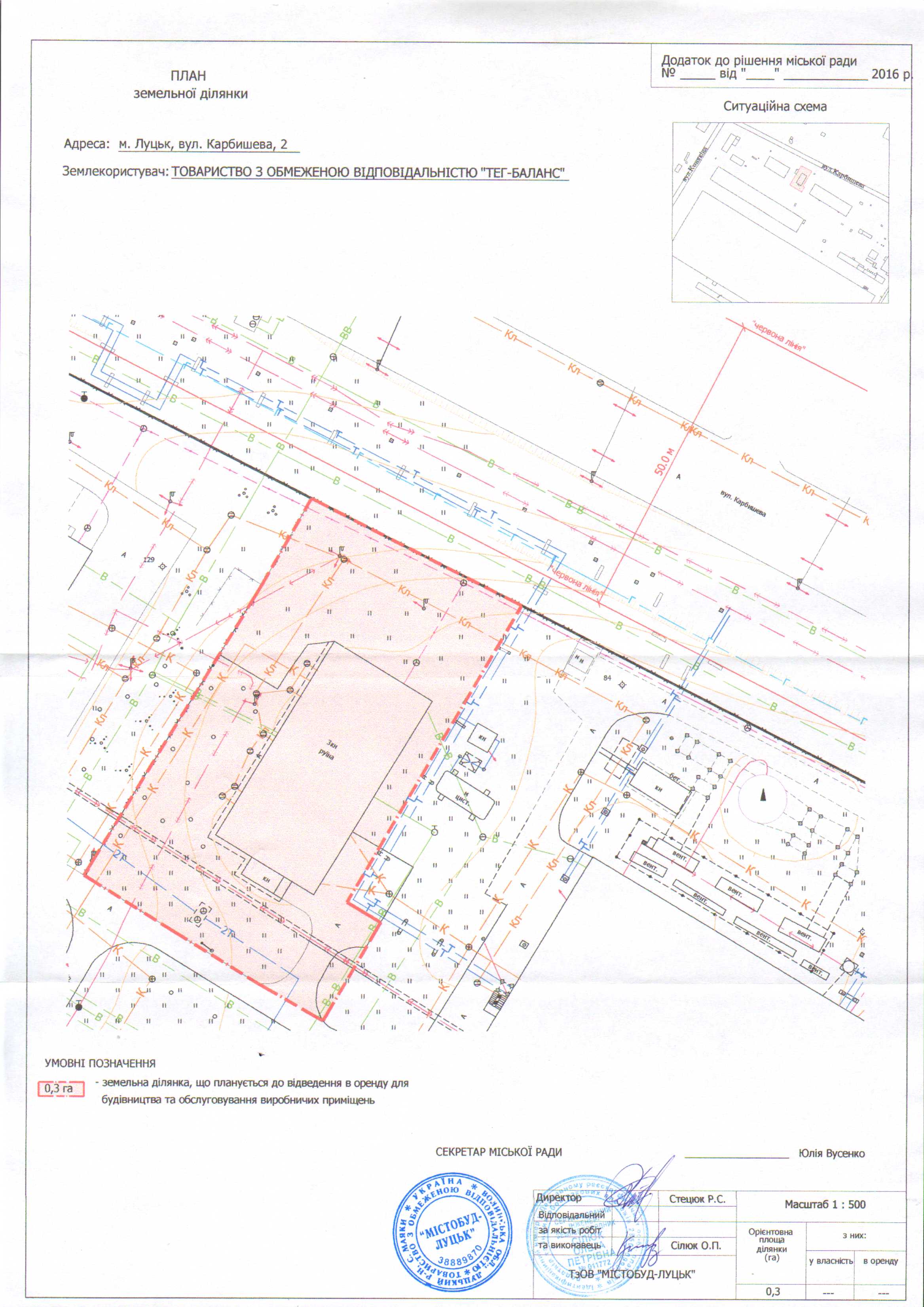 Розглянувши клопотання ТОВАРИСТВА З ОБМЕЖЕНОЮ ВІДПОВІДАЛЬНІСТЮ «ТЕГ-БАЛАНС» про надання дозволу на розроблення проекту землеустрою щодо відведення земельної ділянки в оренду на вул. Карбишева, 2 для будівництва та обслуговування виробничих приміщень, схему генплану земельної ділянки з прикладеним листом управління містобудування та архітектури Луцької міської ради щодо режиму забудови даної території, визначеної для містобудівних потреб, встановлених у генеральному плані міста Луцька, враховуючи рішення міської ради від 29.03.2013 № 39/83 «Про припинення відкритому акціонерному товариству Луцький шовковий комбінат «Волтекс» права постійного користування земельними ділянками на території м. Луцька», витяг з протоколу пленарного засідання сімдесят шостої сесії Луцької міської ради VI скликання від 29.07.2015, 30.07.2015, керуючись статтями 12, 79-1, 93, 123 Земельного Кодексу України, статтею 6 Закону України «Про оренду землі», статтею 50 Закону України «Про землеустрій», Законом України «Про регулювання містобудівної діяльності», Законом України «Про внесення змін до деяких законодавчих актів України щодо розмежування земель державної та комунальної власності», ст. 26 Закону України «Про місцеве самоврядування в Україні», міська рада