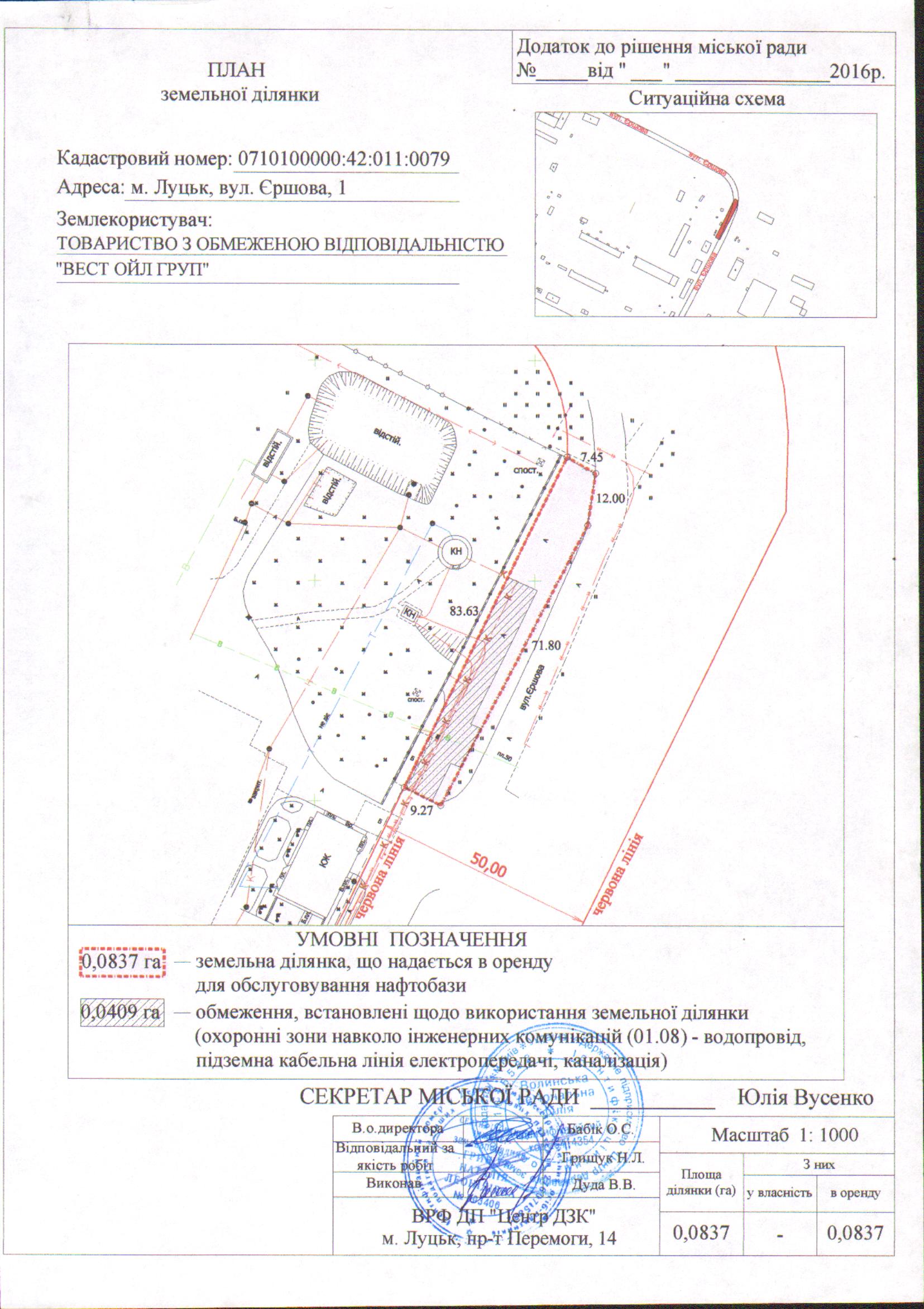 2. Надати ТОВАРИСТВУ З ОБМЕЖЕНОЮ ВІДПОВІДАЛЬНІСТЮ «ВЕСТ ОЙЛ ГРУП» земельну ділянку на вул. Єршова, 1, на умовах оренди строком на 10 років, площею 0,0837 га, кадастровим номером 0710100000:42:011:0079, для обслуговування нафтобази, згідно з додатком.