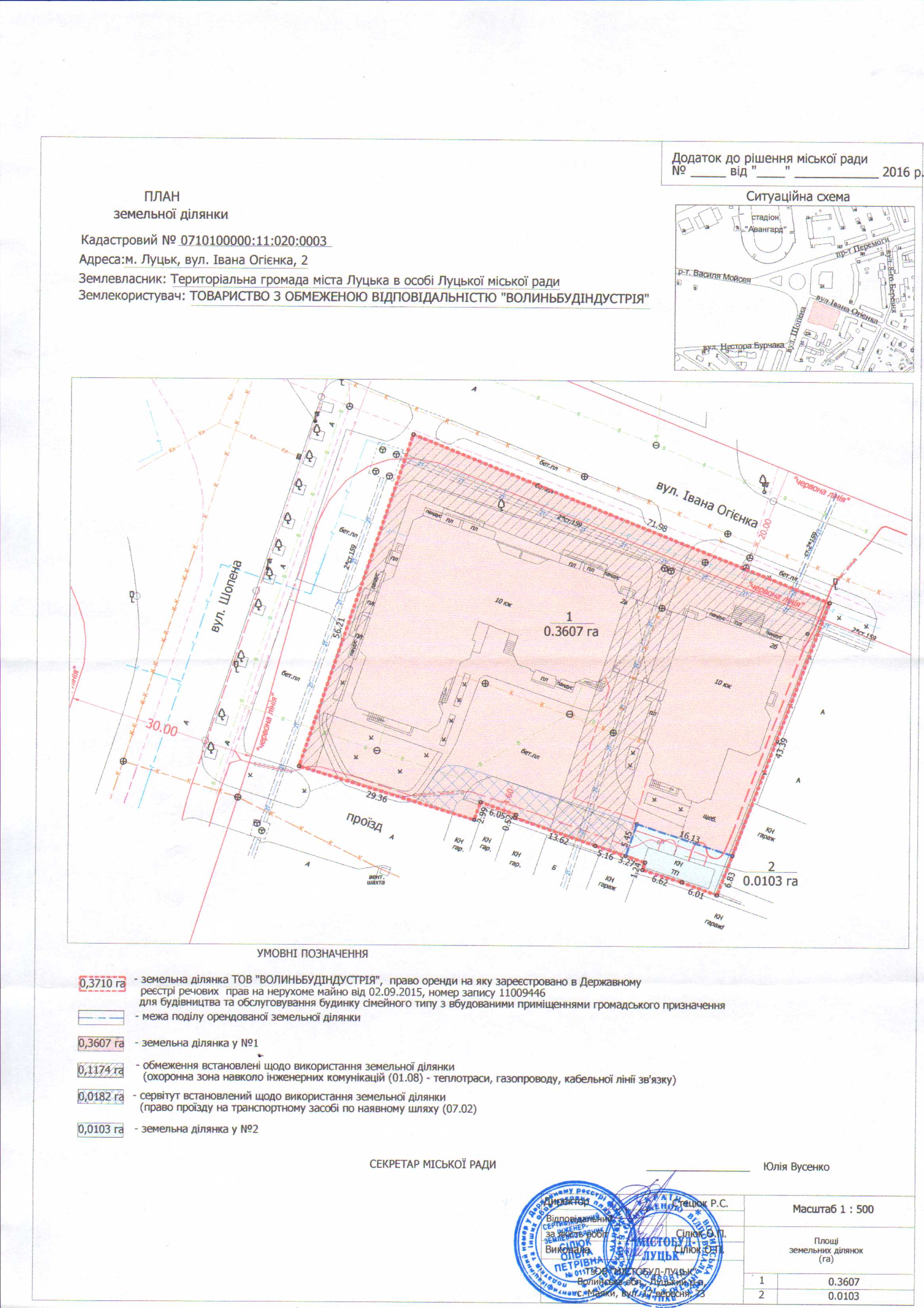 Розглянувши клопотання ТОВАРИСТВА З ОБМЕЖЕНОЮ ВІДПОВІДАЛЬНІСТЮ «ВОЛИНЬБУДІНДУСТРІЯ» щодо надання згоди на поділ орендованої земельної ділянки на вул. Івана Огієнка, 2, договір оренди землі, укладений між Луцькою міською радою та ТОВАРИСТВОМ З ОБМЕЖЕНОЮ ВІДПОВІДАЛЬНІСТЮ «ВОЛИНЬБУДІНДУСТРІЯ», відповідно до якого право оренди земельної ділянки зареєстроване в Державному реєстрі речових прав на нерухоме майно 02.09.2015, номер запису 11009446, витяг з Державного земельного кадастру про земельну ділянку від 03.08.2016 № НВ-0702240102016, схему поділу земельної ділянки на вул. Івана Огієнка, 2, враховуючи декларацію про готовність до експлуатації об’єкта, який належить до І-ІІІ категорії складності, зареєстровану відділом державного архітектурно-будівельного контролю Луцької міської ради від 28.07.2016 № ВЛ 143162101674, декларацію про готовність до експлуатації об’єкта, який належить до І-ІІІ категорії складності, зареєстровану відділом державного архітектурно-будівельного контролю Луцької міської ради від 28.07.2016 № ВЛ 143162100816, керуючись статтями 12, 79-1, 186 Земельного кодексу України, статтею 56 Закону України «Про землеустрій», статтею 27 Закону України «Про Державний земельний кадастр», Законом України «Про внесення змін до деяких законодавчих актів України щодо розмежування земель державної та комунальної власності», статтею 26 Закону України «Про місцеве самоврядування в Україні», Законом України «Про державну реєстрацію речових прав на нерухоме майно та їх обтяжень», пунктами 135-136 Постанови Кабінету Міністрів України від 17.10.2012 № 1051 «Про затвердження Порядку ведення Державного земельного кадастру», міська рада