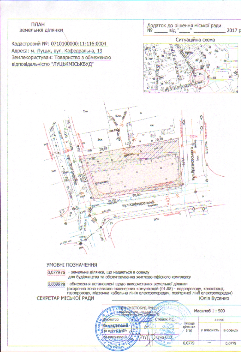 2. Надати товариству з обмеженою відповідальністю «ЛУЦЬКМІСЬКБУД» земельну ділянку на вул. Кафедральній, 13, на умовах оренди строком на 5 років, площею 0,0779 га, кадастровим номером 0710100000:11:116:0004, для будівництва та обслуговування житлово-офісного комплексу, згідно з додатком.