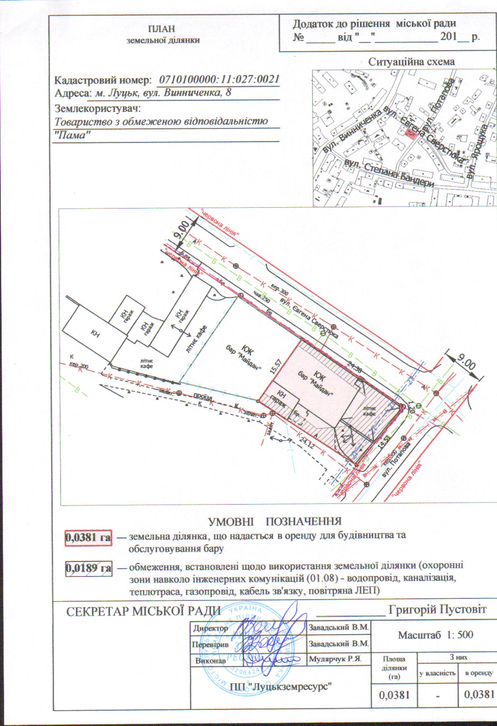 3. Укласти з товариством з обмеженою відповідальністю «Пама» договір оренди земельної ділянки на вул. Винниченка, 8 на вказаних в даному рішенні умовах, а також оформити інші документи, необхідні для вчинення цієї угоди.