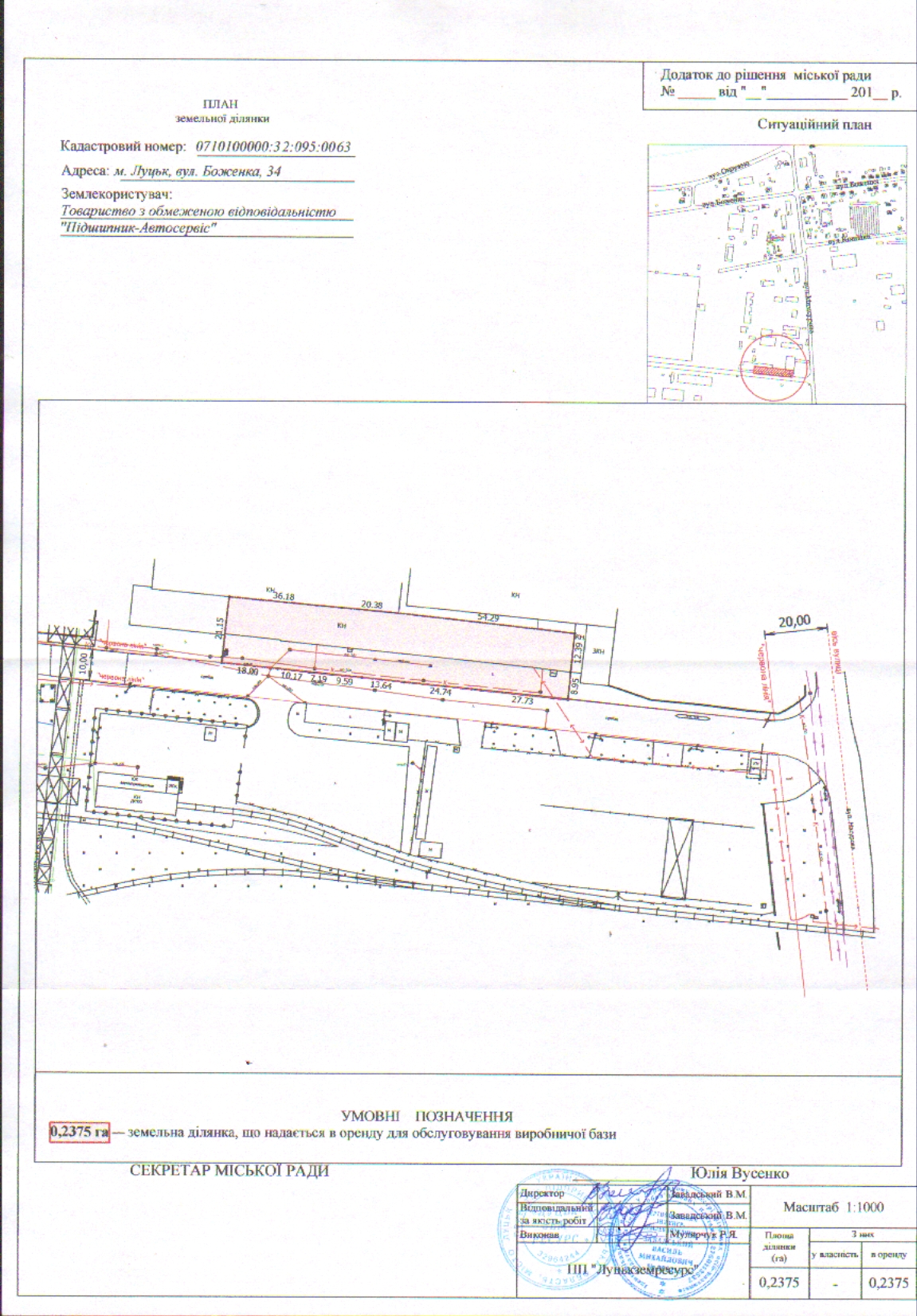 3. Надати товариству з обмеженою відповідальністю «Підшипник-Автосервіс» земельну ділянку на вул. Боженка, 34 на умовах оренди строком на 10 років, площею 0,2375 га, кадастровим номером 0710100000:32:095:0063, для обслуговування виробничої бази, згідно з додатком.