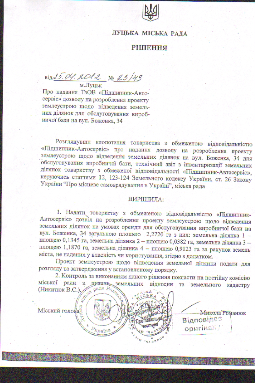 1. Скасувати рішення Луцької міської ради від 25.04.2012 № 23/43 «Про надання ТзОВ «Підшипник-Автосервіс» дозволу на розроблення проекту землеустрою щодо відведення земельних ділянок для обслуговування виробничої бази на вул. Боженка, 34».