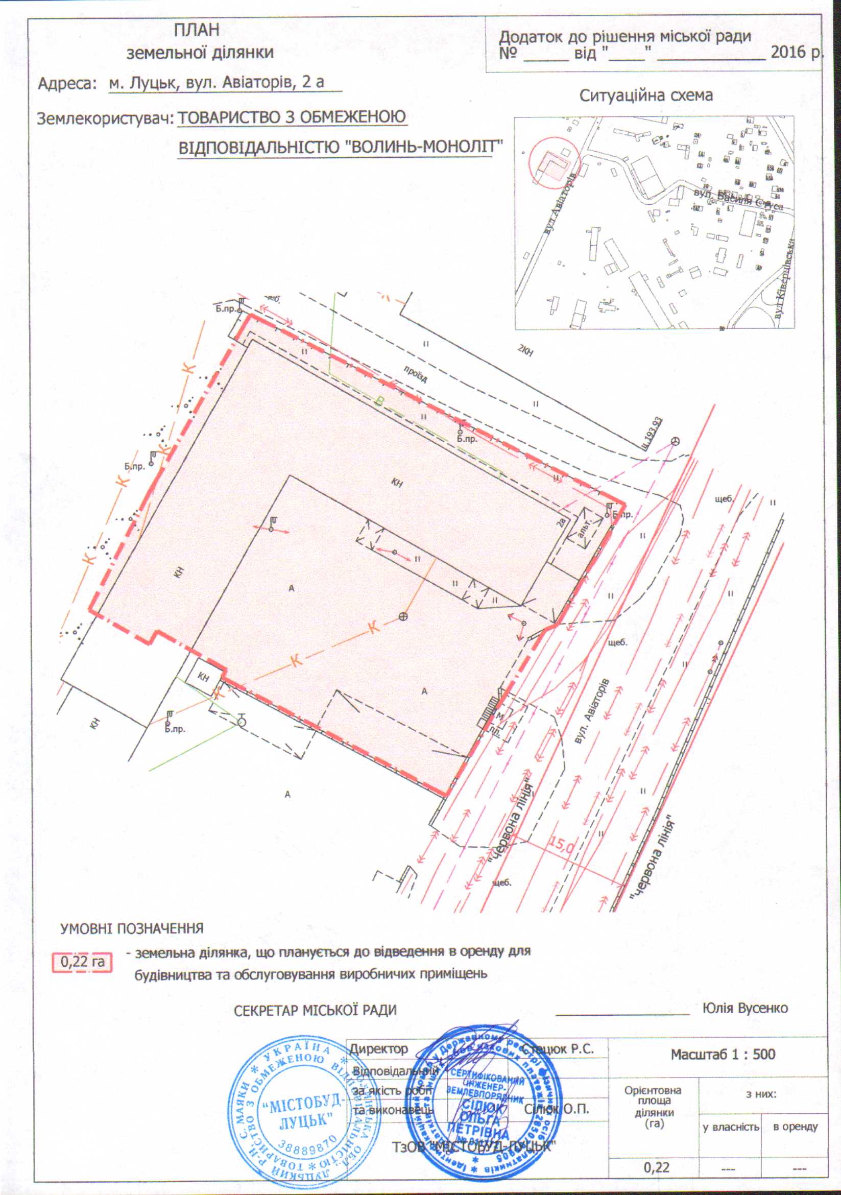 Розглянувши клопотання ТОВАРИСТВА З ОБМЕЖЕНОЮ ВІДПОВІДАЛЬНІСТЮ «ВОЛИНЬ-МОНОЛІТ» про надання дозволу на розроблення проекту землеустрою щодо відведення земельної ділянки в оренду на вул. Авіаторів, 2а для будівництва та обслуговування виробничих приміщень, схему генплану земельної ділянки з прикладеним листом управління містобудування та архітектури Луцької міської ради щодо режиму забудови даної території, визначеної для містобудівних потреб, встановлених у генеральному плані міста Луцька, керуючись статтями 12, 79-1, 93, 123 Земельного кодексу України, статтею 6 Закону України «Про оренду землі», статтею 50 Закону України «Про землеустрій», Законом України «Про регулювання містобудівної діяльності», Законом України «Про внесення змін до деяких законодавчих актів України щодо розмежування земель державної та комунальної власності», статтею 26 Закону України «Про місцеве самоврядування в Україні», міська рада