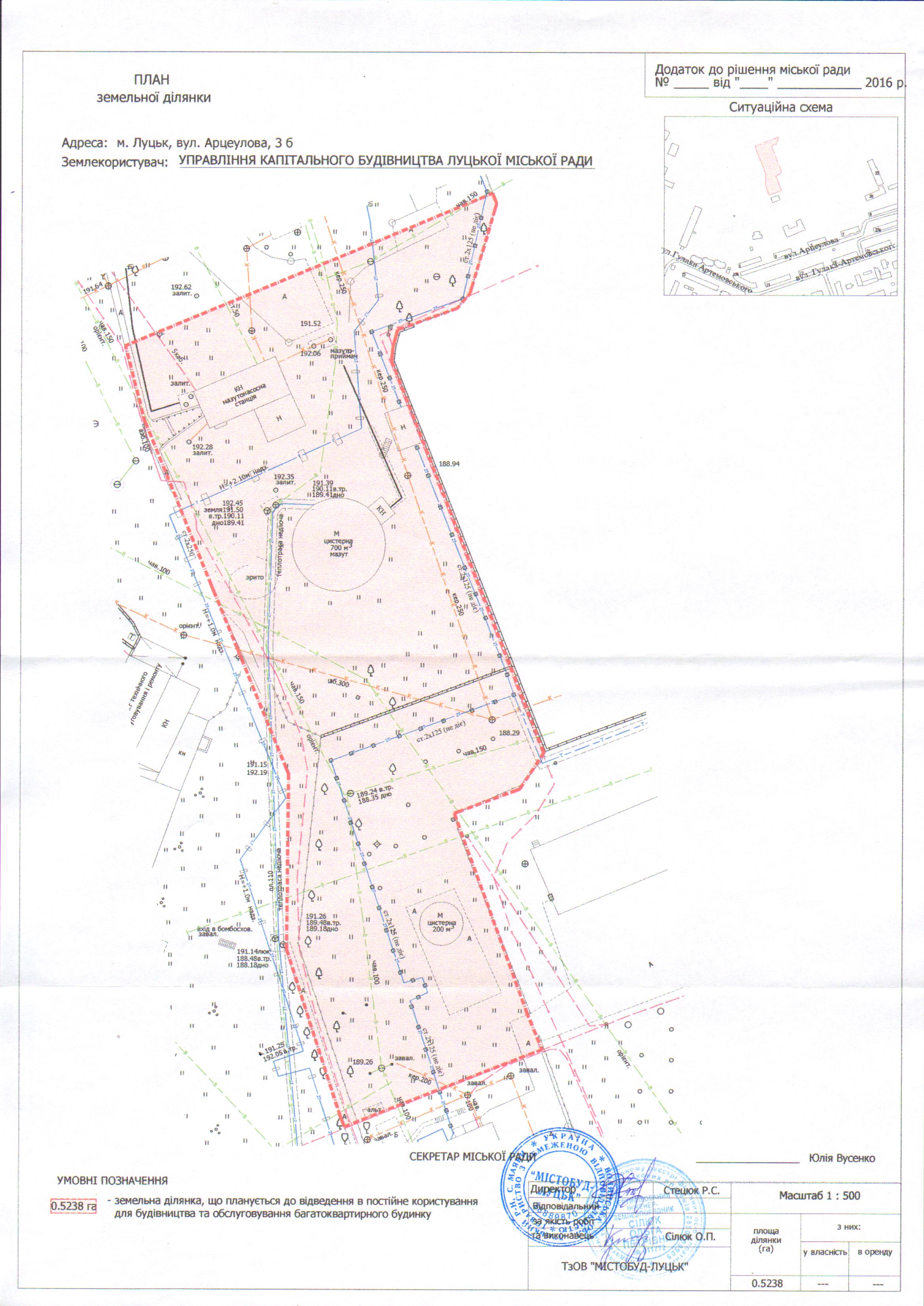 2. Управлінню капітального будівництва Луцької міської ради подати на затвердження розроблений проект землеустрою щодо відведення земельної ділянки для будівництва та багатоквартирного будинку на вул. Арцеулова, 3б, площею 0,5238 га, кадастровим номером 0710100000:22:208:0018, в порядку, визначеному чинним законодавством України.