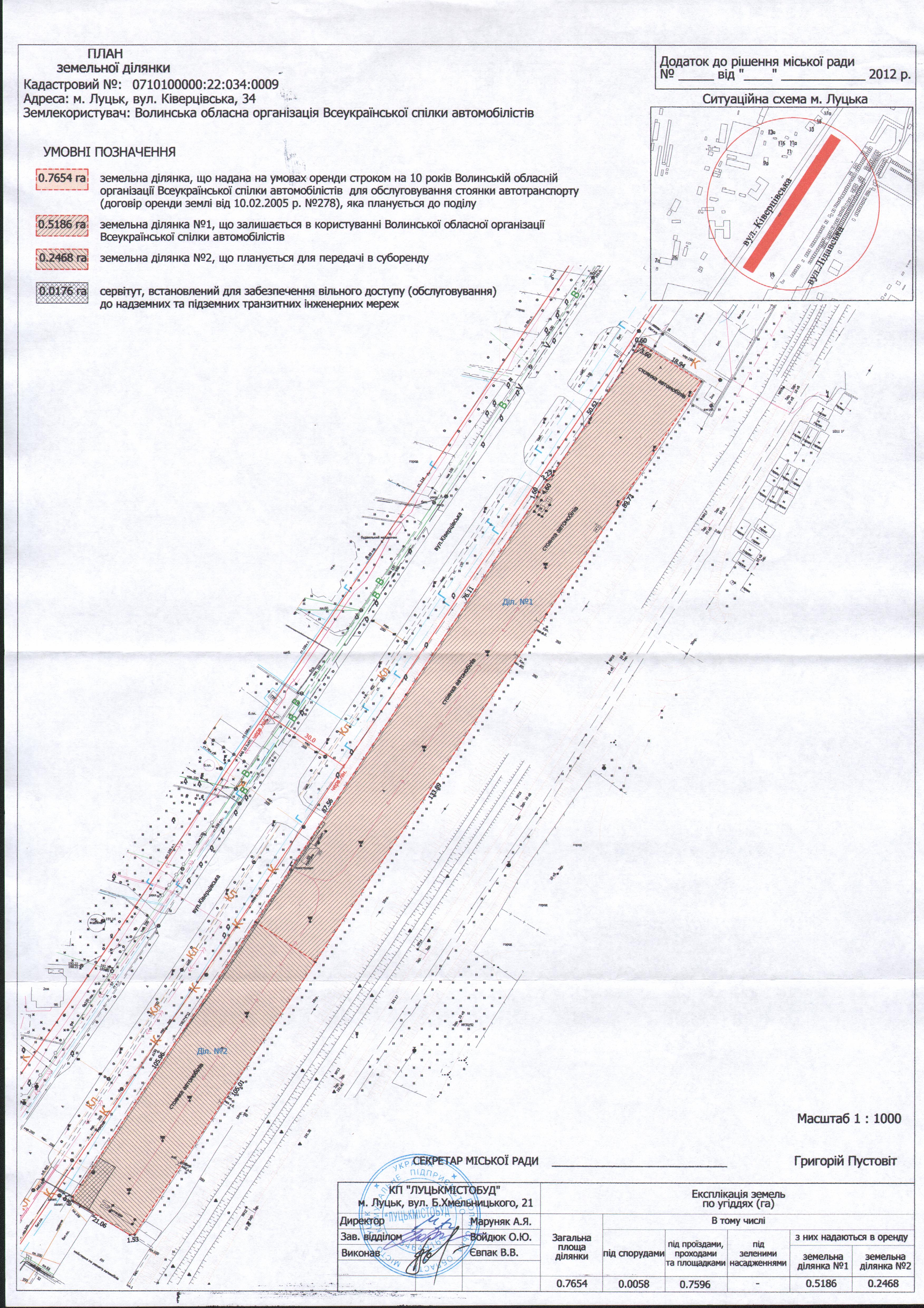 1. Надати згоду Волинській обласній організації Всеукраїнської спілки автомобілістів на поділ орендованої земельної ділянки на вул. Ківерцівській, 34, площею 0,7654 га, наданої в користування на умовах оренди для обслуговування стоянки автотранспорту.