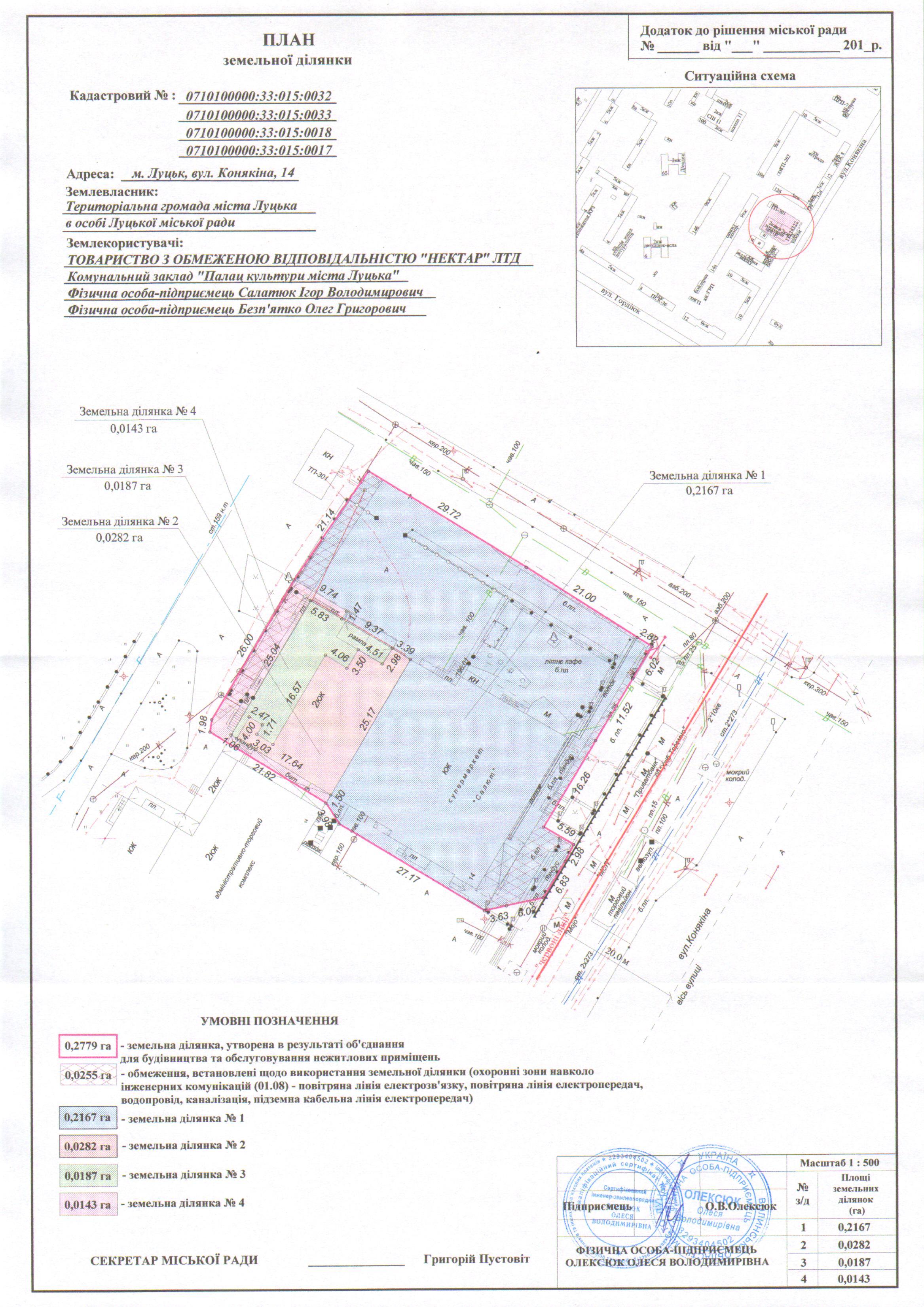 Розглянувши клопотання ТОВАРИСТВА З ОБМЕЖЕНОЮ ВІДПОВІДАЛЬНІСТЮ «НЕКТАР» ЛТД, Комунального закладу «Палац культури міста Луцька», фізичної особи-підприємця Салатюка Ігоря Володимировича, фізичної особи-підприємця Безп’ятка Олега Григоровича щодо об’єднання земельних ділянок комунальної власності на вул. Конякіна, 14, які перебувають у користуванні для будівництва та обслуговування нежитлових приміщень, договори оренди землі, укладені між Луцькою міською радою та ТОВАРИСТВОМ З ОБМЕЖЕНОЮ ВІДПОВІДАЛЬНІСТЮ «НЕКТАР» ЛТД, зареєстровані у Державному реєстрі земель від 17.03.2009 за № 040907700168, № 040907700169, № 040907700170, № 040907700171, строк дії яких закінчився, акти приймання-передачі земельних ділянок від 20.01.2015, договір оренди землі, укладені між Луцькою міською радою та фізичною особою-підприємцем Горошком Володимиром Павловичем, зареєстрований в книзі записів державної реєстрації договорів оренди землі 28.12.2005 за № 040507700128, строк дії якого закінчився, акти приймання-передачі земельних ділянок від 27.03.2015, технічну документацію щодо поділу та об'єднання земельних ділянок на вул. Конякіна, 14, витяг з Державного земельного кадастру про земельну ділянку площею 0,2167 га від 19.09.2017 № НВ-0000838902017, витяг з Державного земельного кадастру про земельну ділянку площею 0,0282 га від 19.09.2017 № НВ-0000838912017, витяг з Державного земельного кадастру про земельну ділянку площею 0,0187 га від 19.09.2017 № НВ-0000838932017, витяг з Державного земельного кадастру про земельну ділянку площею 0,0143 га від 19.09.2017 № НВ-0000838922017, керуючись статтями 12, 79-1, 186 Земельного кодексу України, статтею 56 Закону України «Про землеустрій», статтею 27 Закону України «Про Державний земельний кадастр», Законом України «Про внесення змін до деяких законодавчих актів України щодо розмежування земель державної та комунальної власності», статтею 26 Закону України «Про місцеве самоврядування в Україні», статтею 4 Закону України «Про державну реєстрацію речових прав на нерухоме майно та їх обтяжень», пунктами 135-136 Постанови Кабінету Міністрів України від 17.10.2012 № 1051 «Про затвердження Порядку ведення Державного земельного кадастру», міська рада