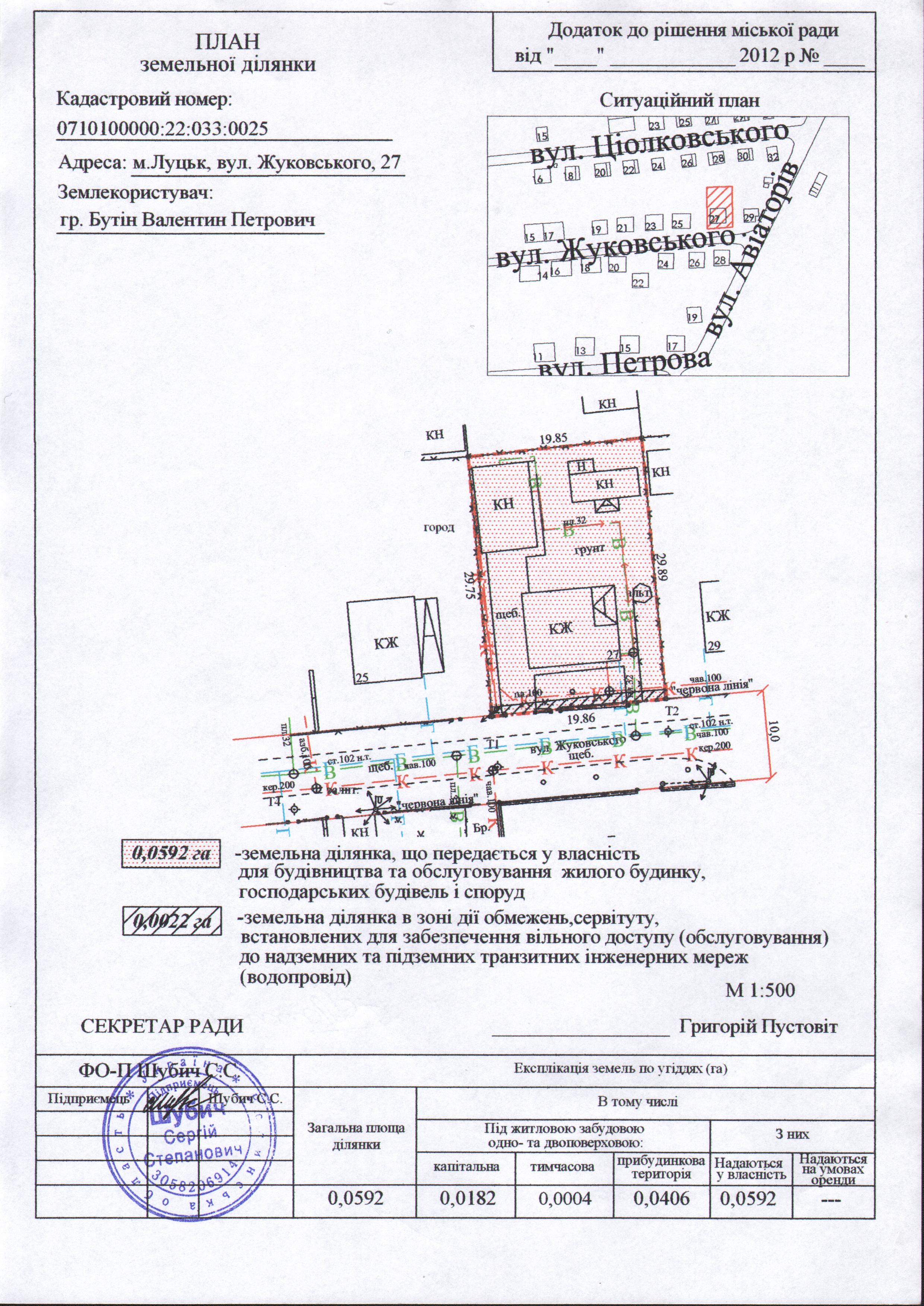 1. Передати гр. Бутіну Валентину Петровичу безоплатно у власність земельну ділянку на вул. Жуковського, 27 площею 0,0592 га для будівництва та обслуговування жилого будинку, господарських будівель і споруд, згідно з додатком.