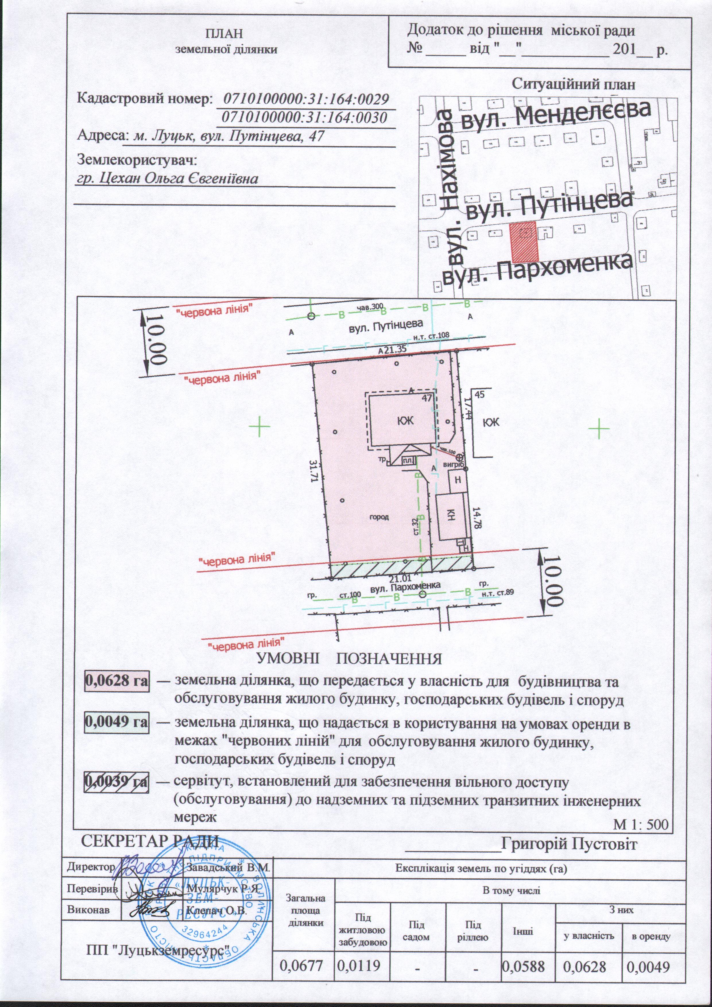 2. Надати гр. Цехан Ользі Євгеніївні в користування на умовах оренди строком на 5 років земельну ділянку на вул. Путінцева, 47 площею 0,0049 га в межах «червоних ліній» для обслуговування жилого будинку, господарських будівель і споруд, згідно з додатком.