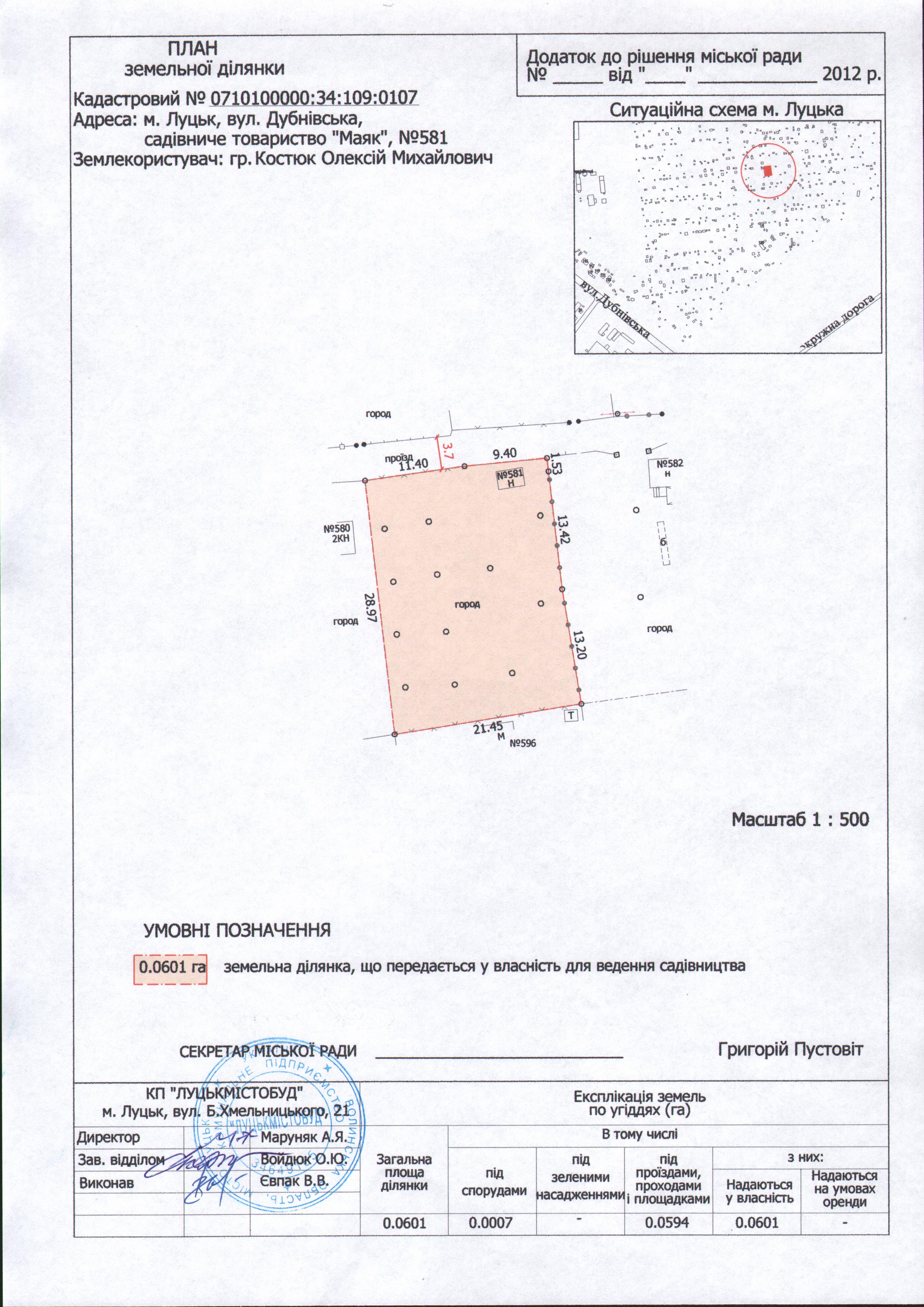 1. Передати гр. Костюку Олексію Михайловичу безоплатно у власність земельну ділянку на вул. Дубнівській в садівничому товаристві «Маяк» № 581 площею 0,0601 га для ведення садівництва, згідно з додатком.