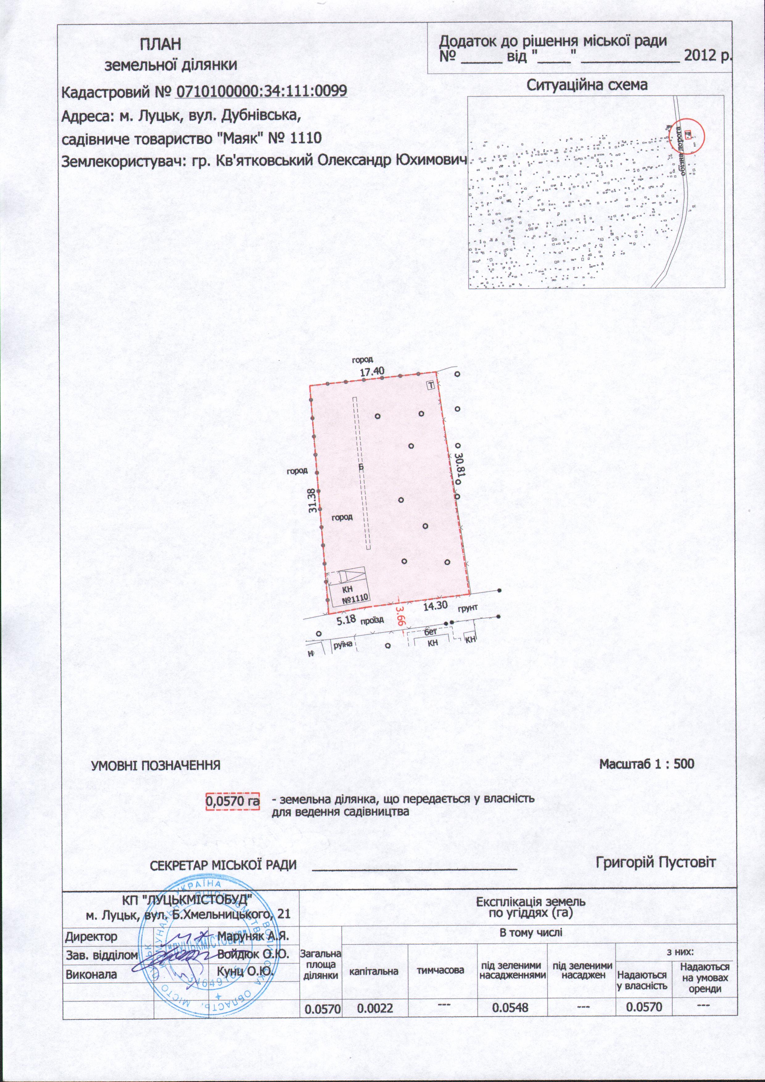 1. Передати гр. Кв’ятковському Олександру Юхимовичу безоплатно у власність земельну ділянку на вул. Дубнівській в садівничому товаристві «Маяк» № 1110 площею 0,0570 га для ведення садівництва, згідно з додатком.